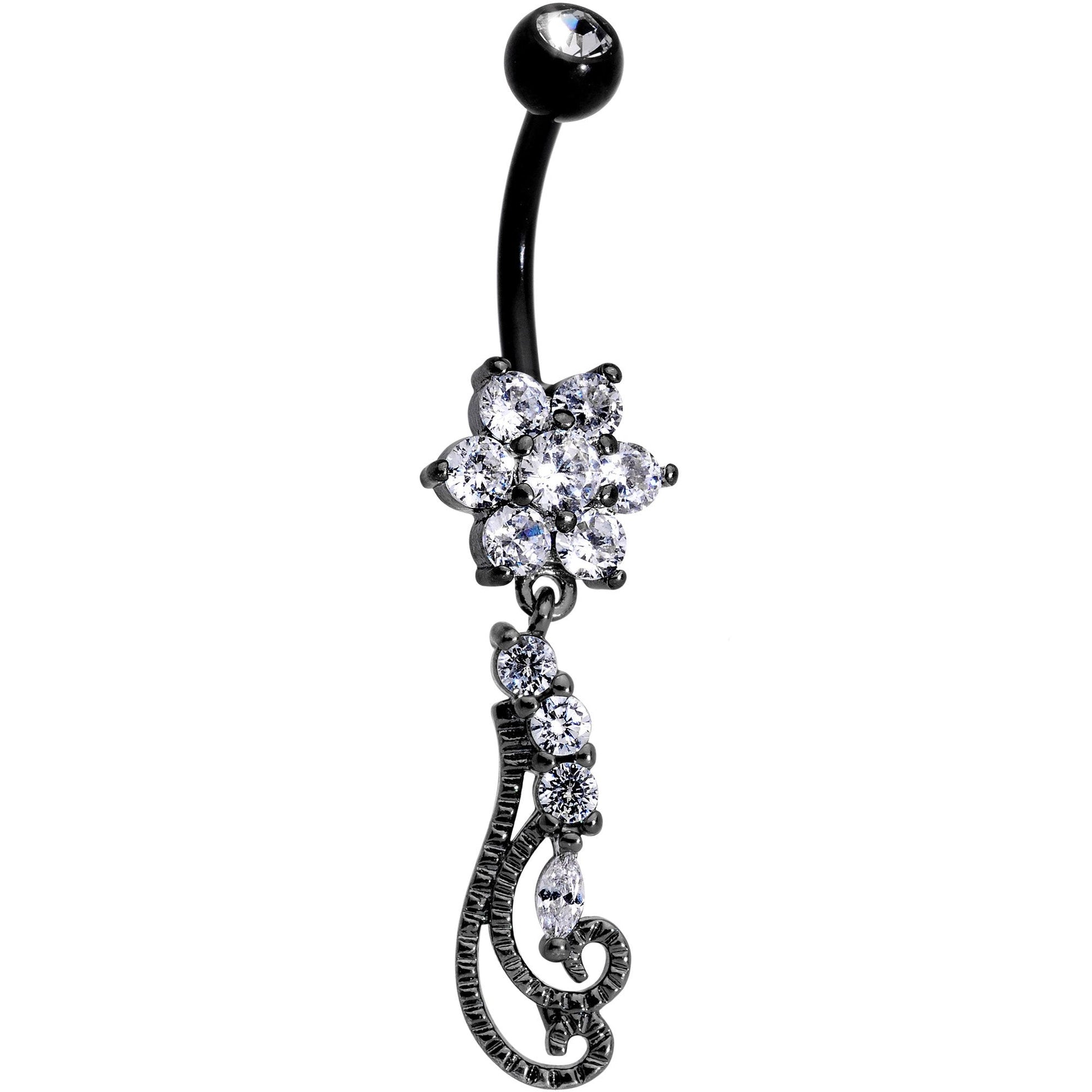 This navel piercing is about as stylish as they come. A unique filigree swirl design decorated by a string of perfect clear gems dangles from a gem encrusted flower charm on this opulent belly button piercing. This 14 gauge is made with a 7/16" in length black anodized over 316L surgical grade stainless steel curved barbell complete with a top ball clear gem. Perfect for any fancy, or even casual, occasion.Specifications