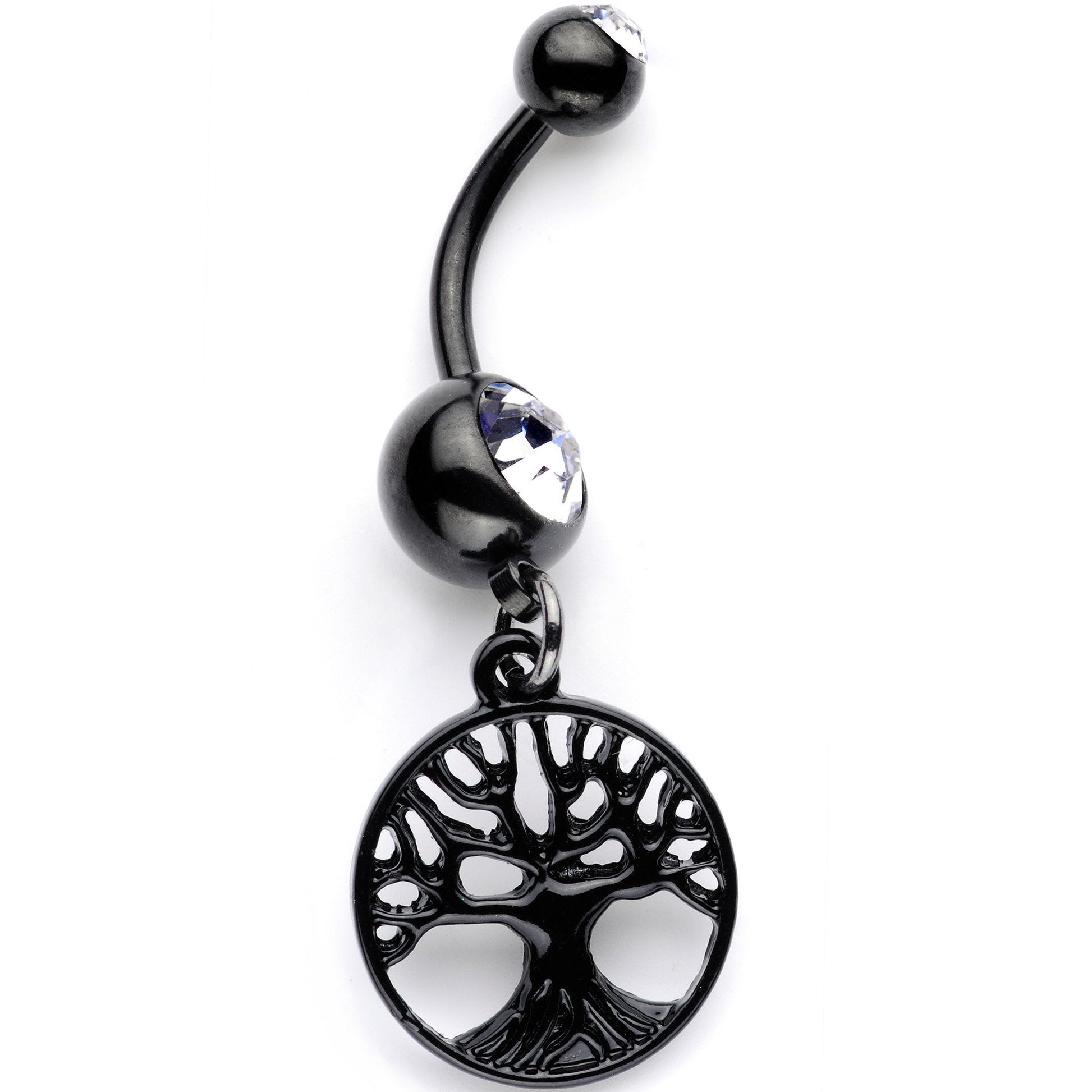 This outdoor-inspired navel piercing is a definite must-have if you're looking for something that's all about natural style. Made with a 7/16" black anodized over 316L surgical grade stainless steel curved barbell, this belly button ring features a black plated circular tree charm and a pair of top and bottom clear gems that catch the eye.Specifications