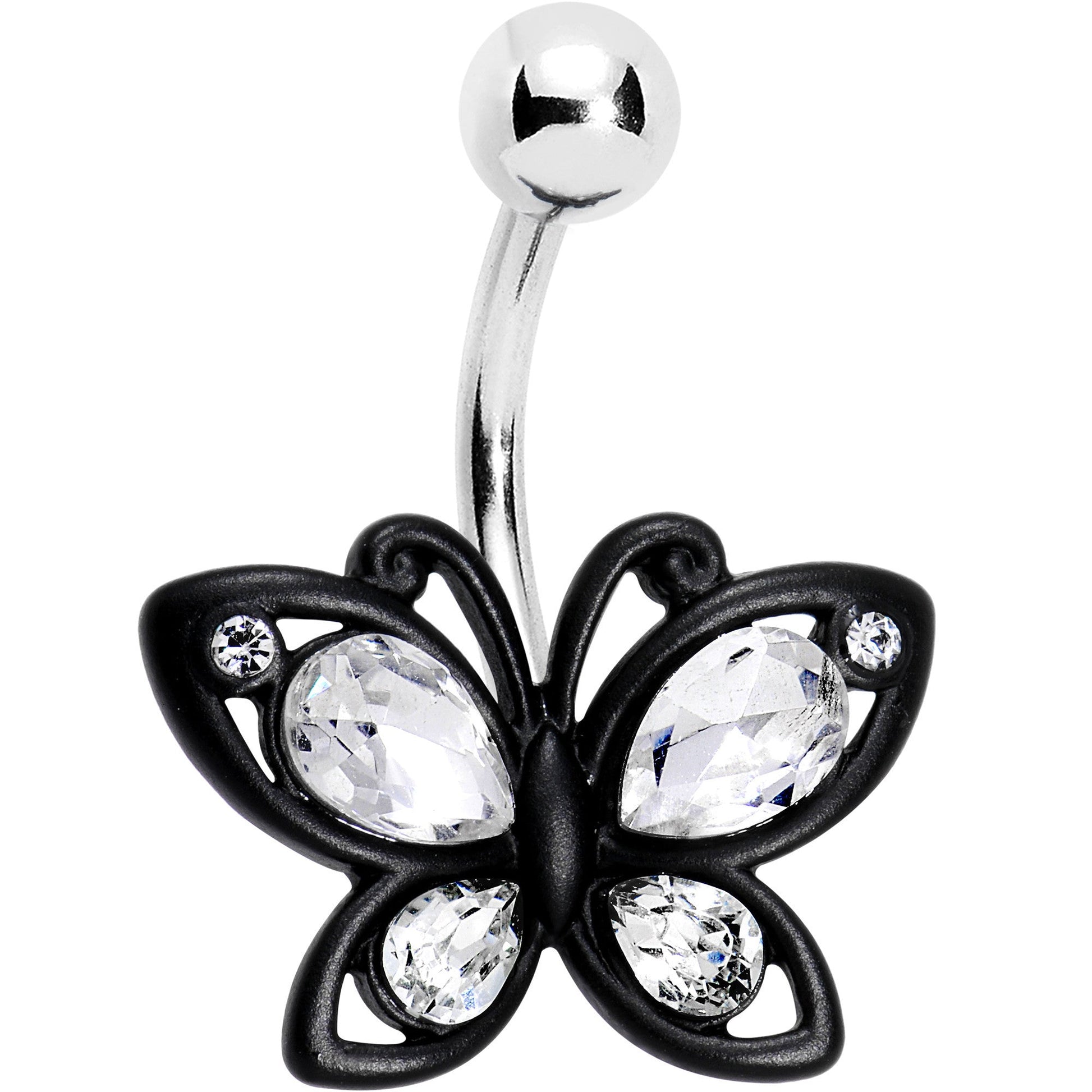 If you love Mother Nature's creatures large and small then you will definitely be interested in this 14 gauge belly button ring. Made with a 3/8" durable 316L surgical grade stainless steel curved barbell, this navel piercing features a black butterfly frame set with clear gem wings to leave you feeling flighty and free wherever you may be.