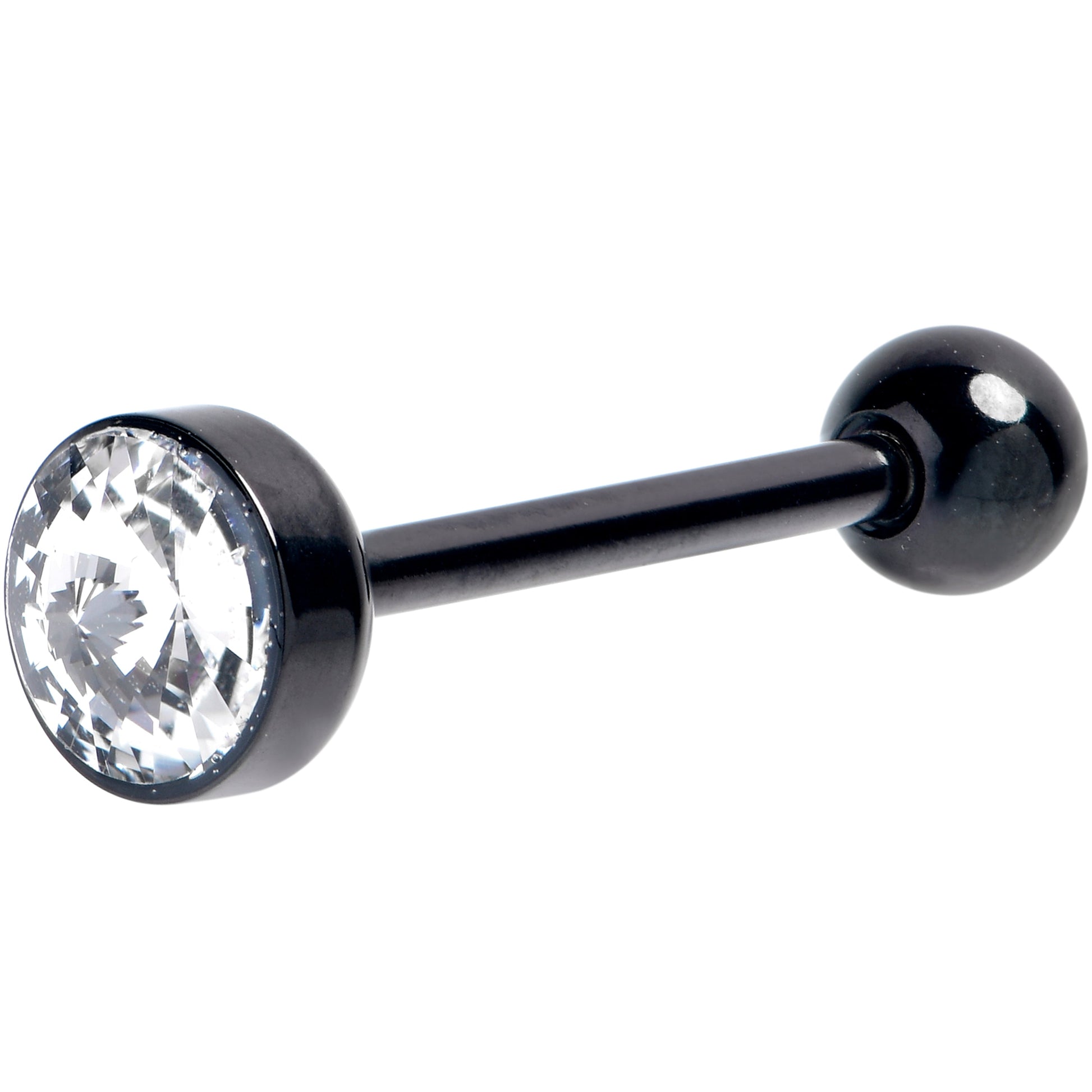 Add a little color and style to your words with this 14 gauge tongue jewelry. It is made with a 5/8 inch black PVD over 316L surgical grade stainless steel straight barbell with a 5mm bottom ball end. It features a disc top end which is set with a clear gem that adds a glamorous touch to a simple style. You will have them hanging on your every word with the understated elegance of this tongue piercing ring.Specifications