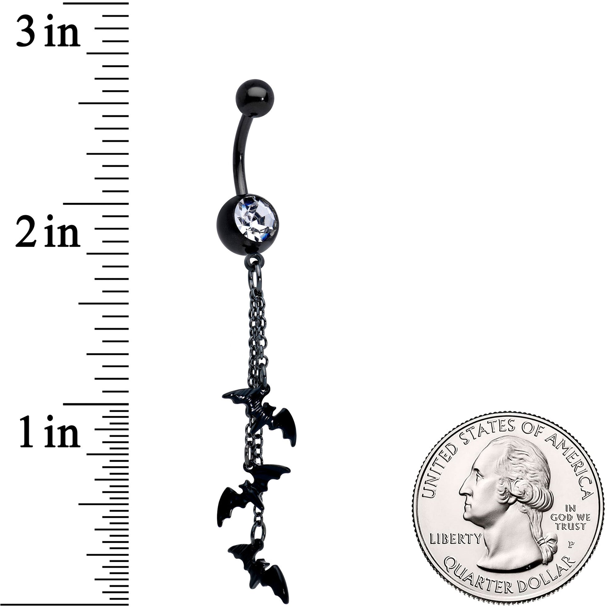 You'll be all dressed up and ready for Halloween when you wear this 14 gauge navel ring! It's made with a 3/8" black plated over 316L surgical grade stainless steel curved barbell with a 5mm top ball end. The bottom ball end is 8mm and set with a clear gem. Dangling beneath it is a series of chain dangles with bat charms for scary fun!Specifications