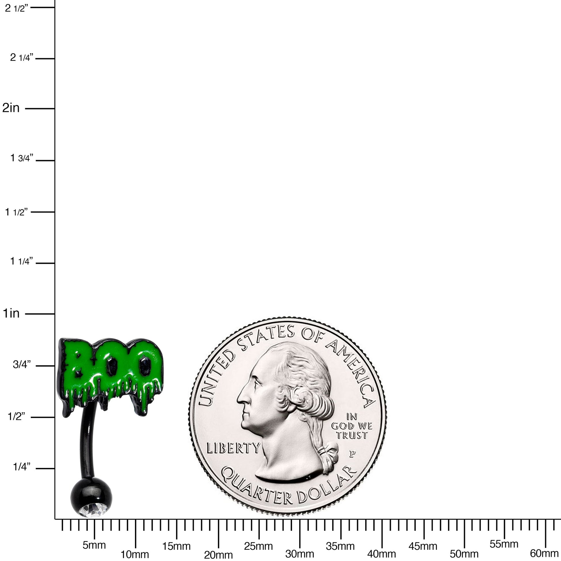 You'll be looking absolutely boo-tiful in this 14 gauge navel ring! It's made with a 3/8" black PVD over 316L surgical grade stainless steel curved barbell. It has a 5mm bottom ball end, which is set with a clear gem. The top end features the word boo, in a vivid shade of green. It's even written in a creepy ooze-inspired font for an absolutely bloodcurdling effect! Change your navel jewelry from "ew" to "woo!" with this creepy Halloween "boo" belly button jewelry!Specifications