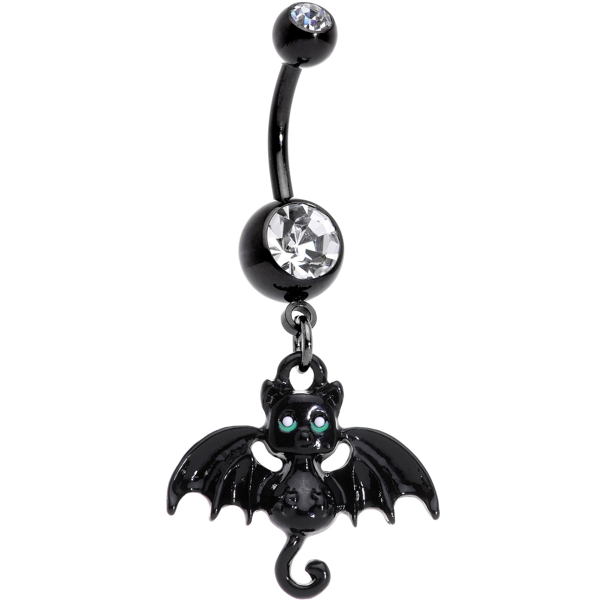 Stop yourself from going batty by wearing this scary 14 gauge belly button ring all season long! Made with a 7/16" black plated over 316L surgical grade stainless steel curved barbell, this navel piercing features a clear top and bottom gem as well as a Halloween bat dangle charm for scary style.Specifications