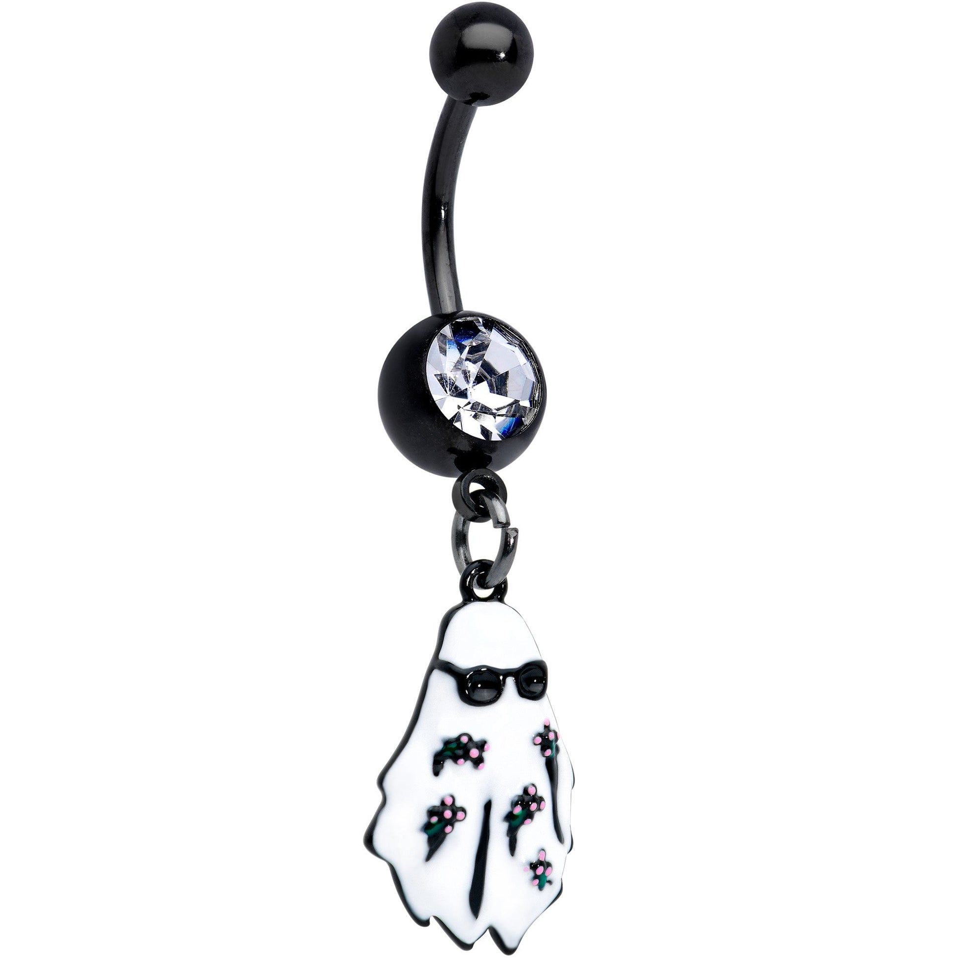 The ghost on this 14 gauge navel ring is oozing with style! It's made with a 3/8" black PVD over 316L surgical grade stainless steel curved barbell with a 5mm top ball end. The bottom ball end is 8mm and set with a large clear gem. Dangling beneath it is a ghost charm, wearing super-cool black shades. The ghost is also wearing a flowered sheet instead of a plain white one. You'll have the hippest Halloween ever with this stylish ghost belly button jewelry!Specifications