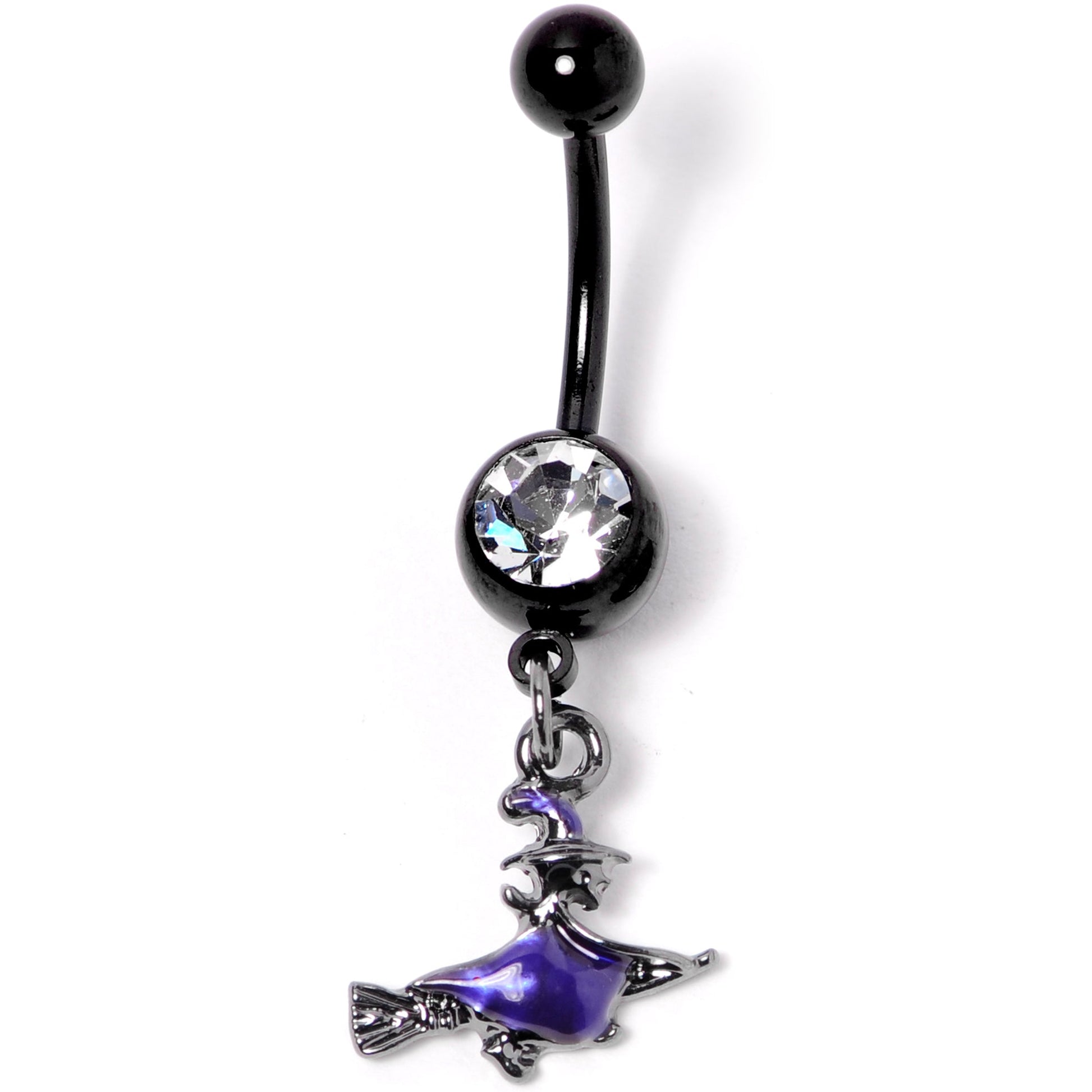 Clear Gem Black Purple Broom Witch Halloween Dangle Belly Ring