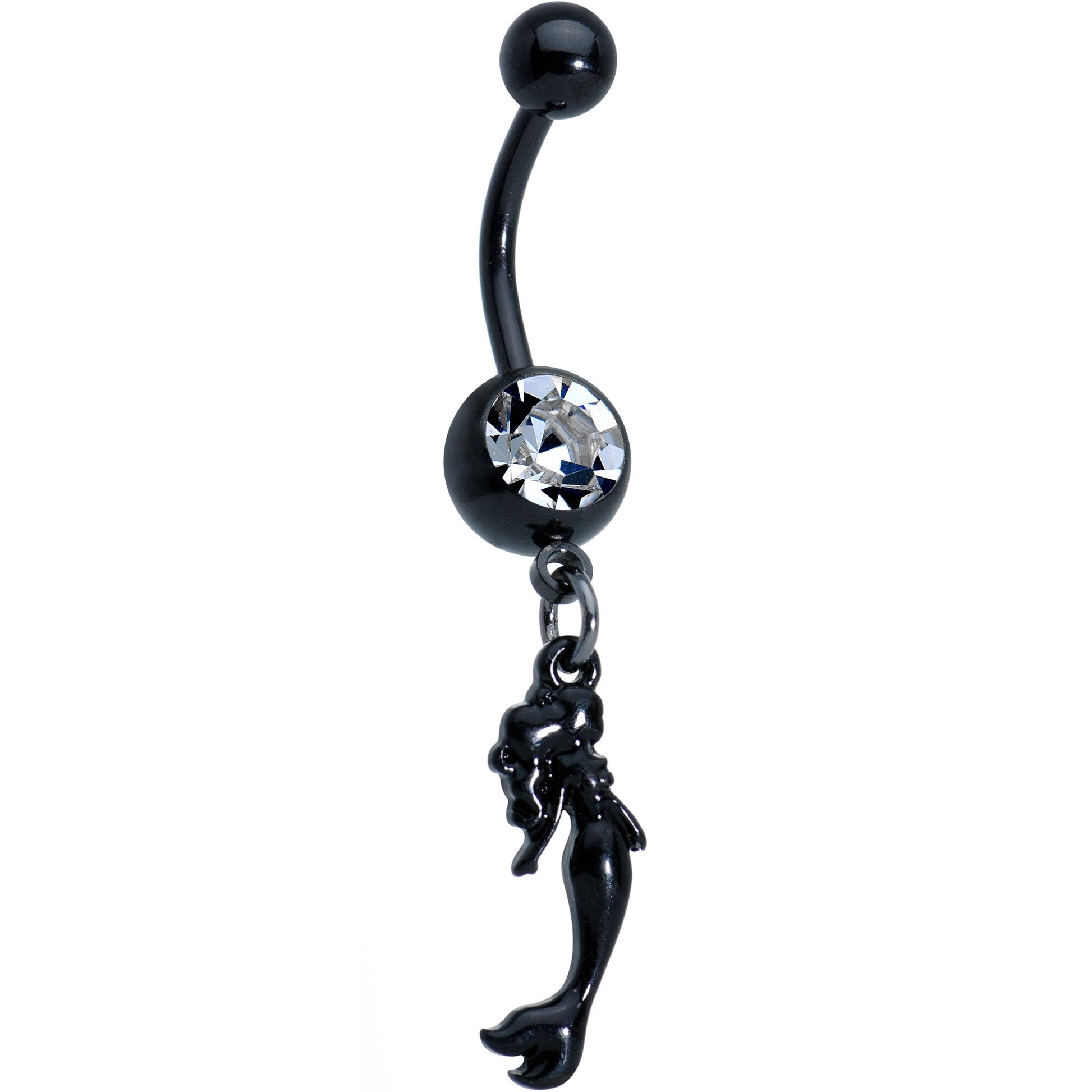 Show off your love of mythical undersea creatures when you wear this fun 14 gauge belly button ring. Made with an 11mm black PVD over 316L surgical grade stainless steel curved barbell, this navel piercing features a clear bottom gem as well as a detailed dangle diving mermaid charm. Don't let this mermaid get away!Specifications