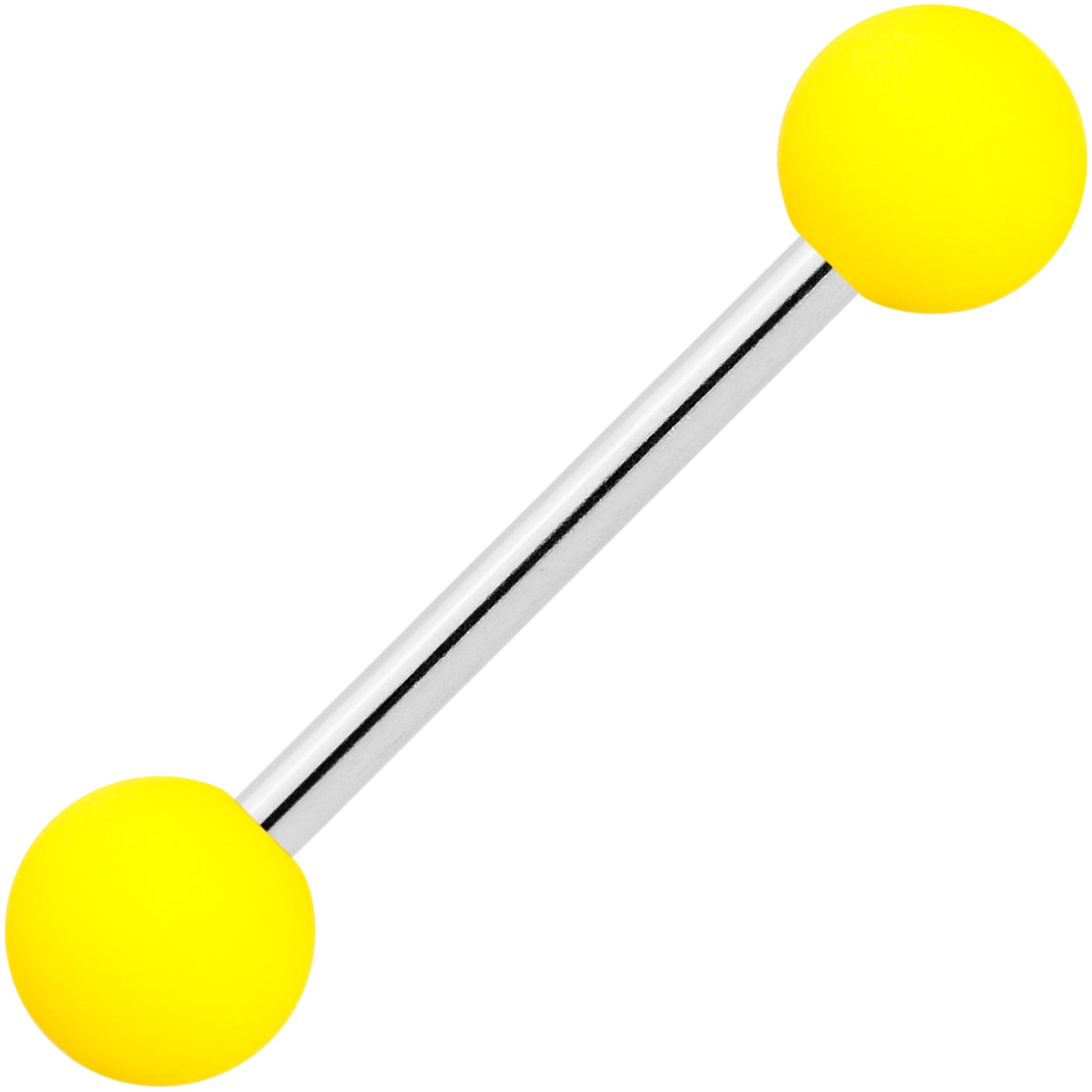 Let your tongue piercing reflect your every mood with this set of 14 gauge tongue rings! Three are made with 5/8" durable 316L surgical grade stainless steel straight barbells. One features 5mm matte yellow ball ends for a simple, subtle appearance. The second features 5mm ball ends, with multicolor stripes for some colorful style. The third one features a 5mm red bottom ball end and a red heart top end, both set with glitter for a whimsical appearance. The fourth one is made with a 5/8" black electroplate over 316L surgical grade stainless steel straight barbell. It has 5mm ball ends, with the top ball end set with a large clear gem. Get a look for every occasion with this stylish set of tongue jewelry! Sold as a set of four.Specifications