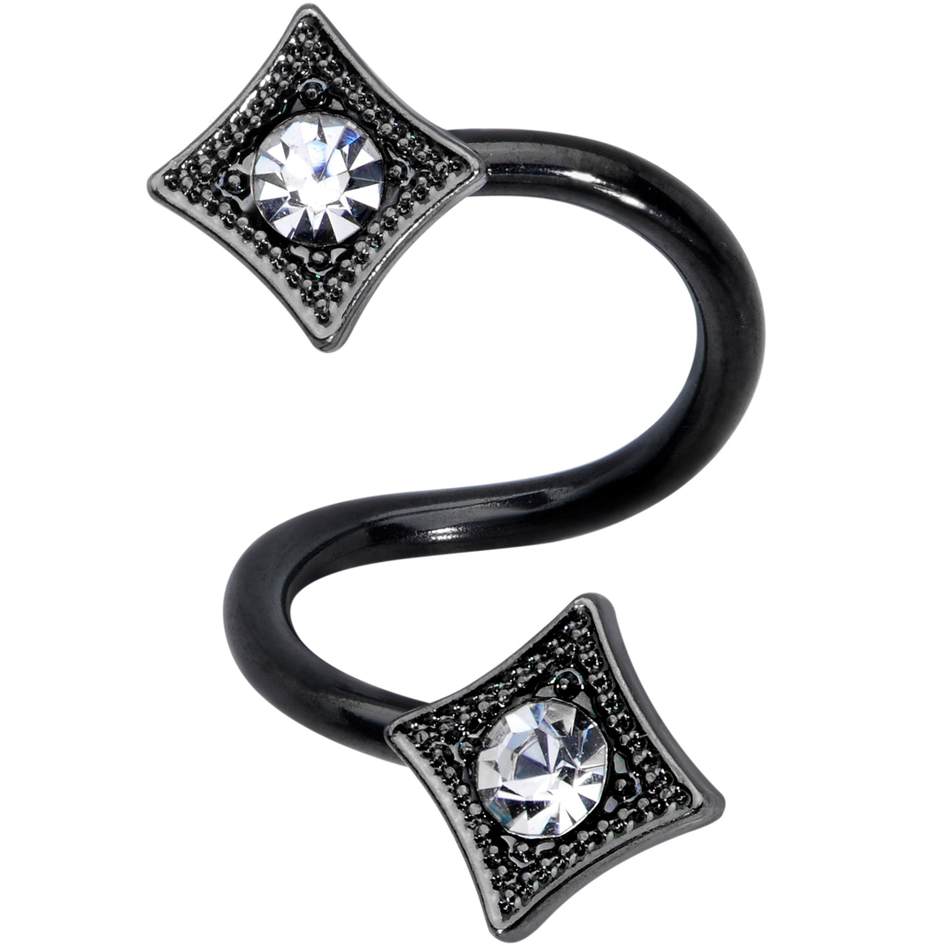 Basic black is bold, beautiful, and totally badass with this set of 14 gauge navel rings! Two are made with 3/8" black PVD over 316L surgical grade stainless steel curved barbells. The first has a 5mm top ball end and an 8mm bottom ball end, both with a sandblasted finish in matching black for a simple appearance. The second features a top end shaped like a textured rhombus and set with a clear gem, while the bottom end features a matching rhombus, also set with a clear gem and sitting inside a circle of matching textured black and set with clear gems. The third one is made with a 3/8" black PVD over 316L surgical grade stainless steel spiral curved barbell. It features ends with a textured rhombus shape with clear gems set at their centers. And this one also works in multiple piercings including lip, some eyebrow piercings and some cartilage piercings! Get a whole jewelry wardrobe in one with this set of bodacious black belly button jewelry! Sold as a set of three.Specifications