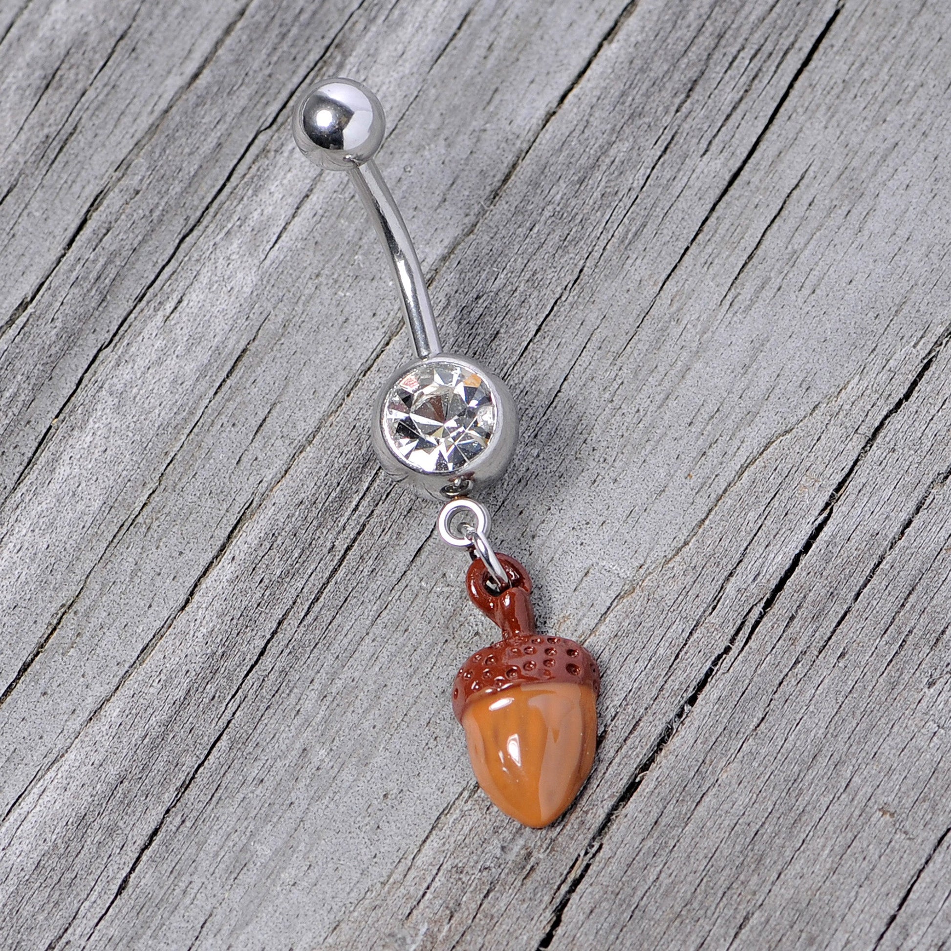 Great big oak trees grow from little acorns. Hot fall looks can too with this autumn-appropriate 14 gauge navel ring! It's made with a 7/16" durable 316L surgical grade stainless steel curved barbell with a 5mm top ball end. The bottom ball end is 8mm and is set with a large clear gem. Dangling from the base is a light brown acorn charm. The acorn's cap is a darker brown and has heavily textured detailing for a look of realism. Grow a new look this fall with adorable, arboreal belly button ring!Specifications