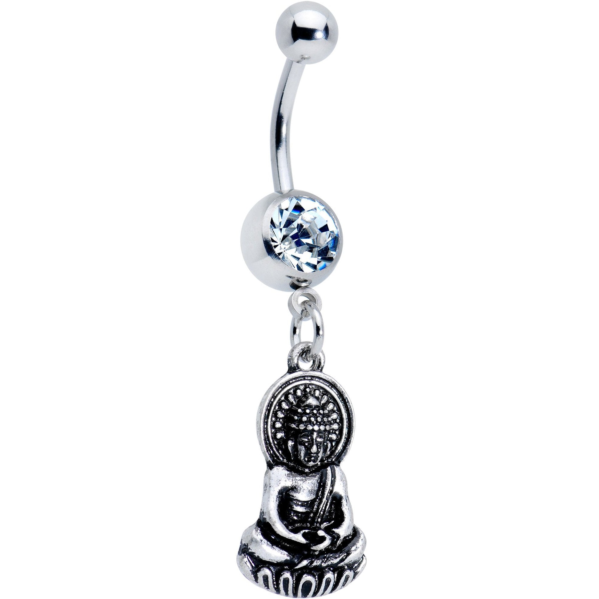 This spiritual Buddha is at peace as he repeats his sacred mantra! The dangle praying Buddha charm on this 14 gauge belly button piercing is in a deep state of meditation. Mounted on a 7/16" curved barbell made with durable 316L surgical grade stainless steel, this Buddha jewelry comes complete with a clear gem bottom ball.Specifications
