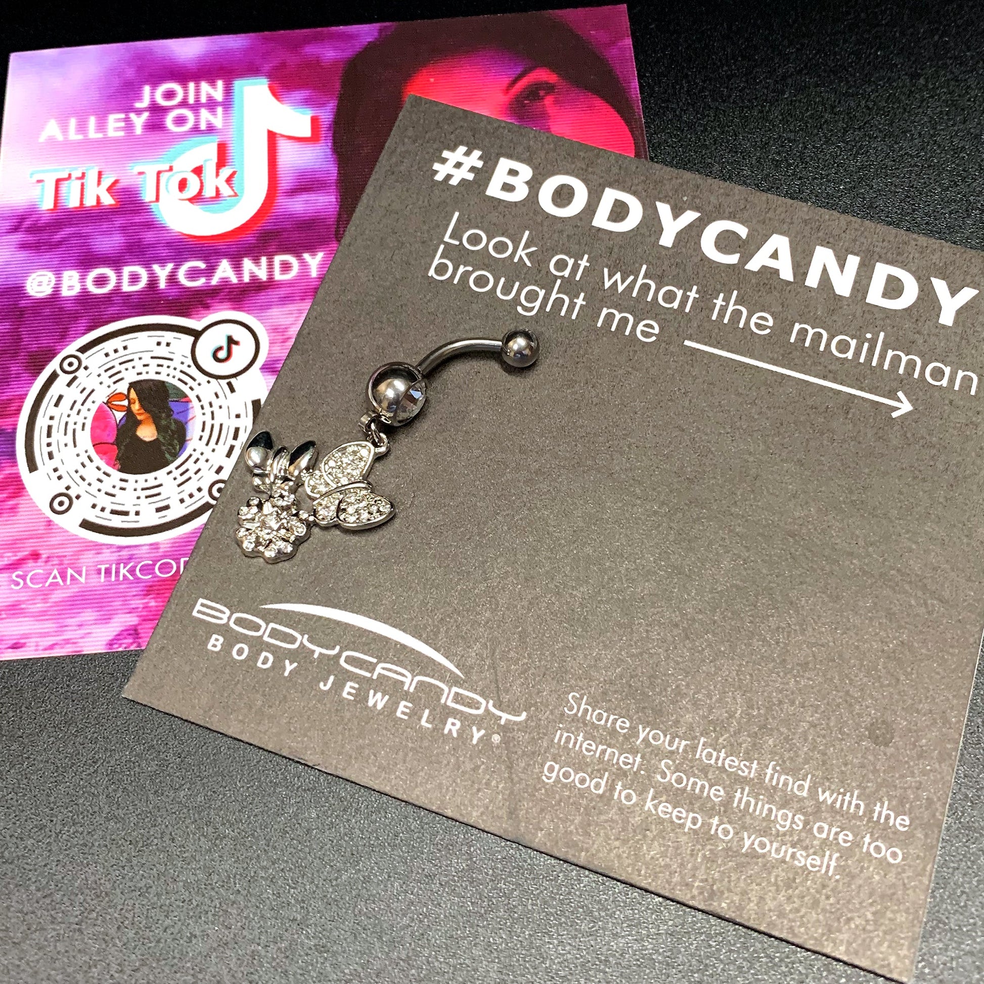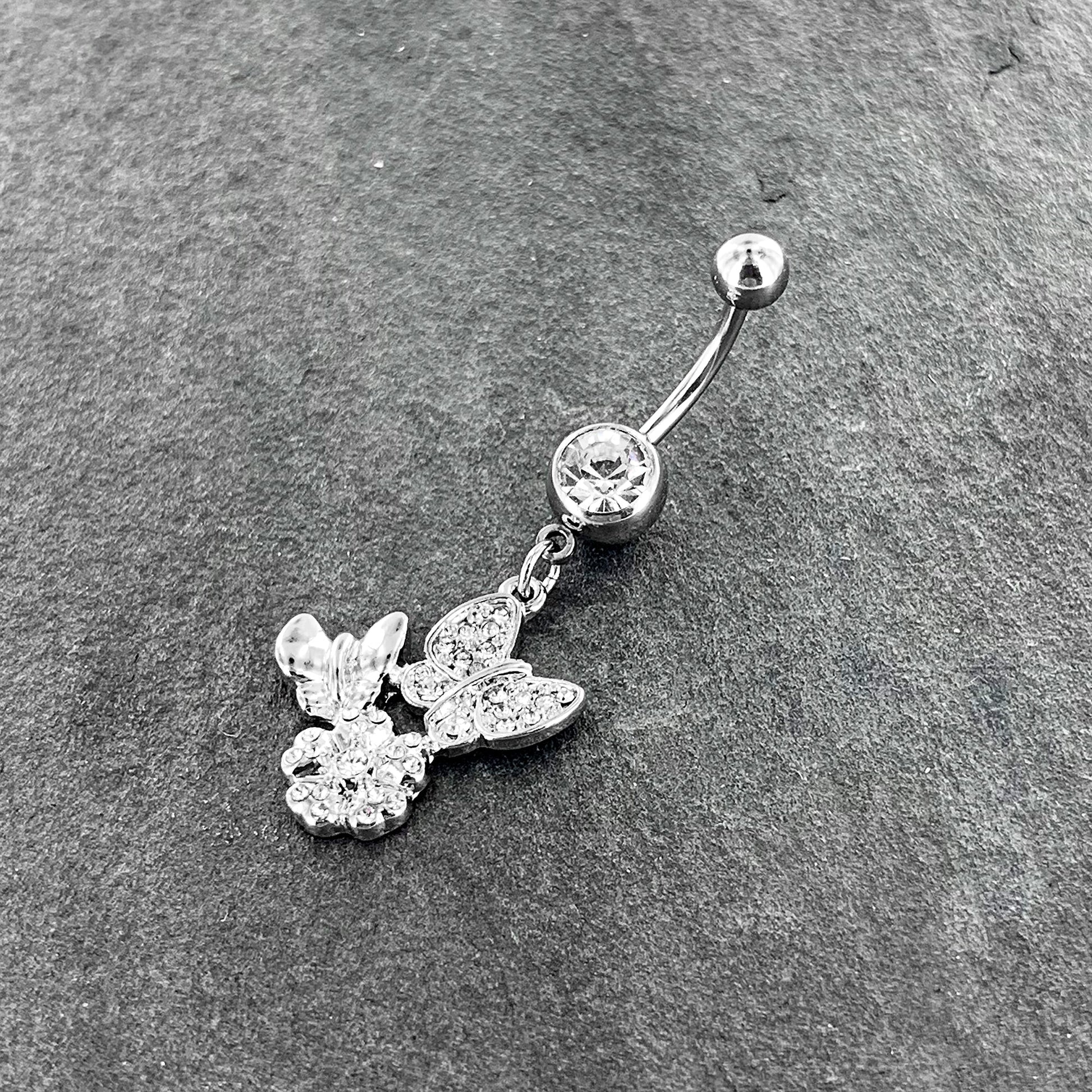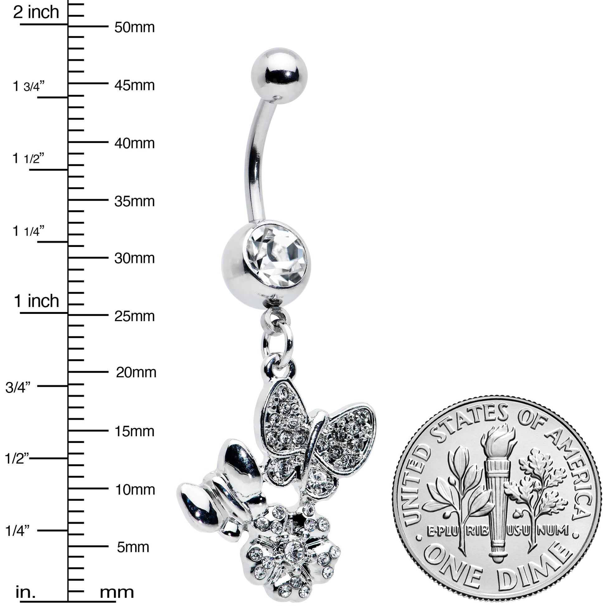 What could be more timeless than butterflies and flowers, like on this 14 gauge navel ring? It's made with a 3/8" durable 316L surgical grade stainless steel curved barbell with a 5mm top ball end. The bottom ball end is 8mm and set with a large clear gem. Dangling beneath is a butterflies charm, with one unadorned and the other paved with clear gems. Both butterflies are hovering over a flower, which is set with a matching clear gem at the center. You'll be feeling butterfly beautiful when you're rocking this classic belly piercing ring!Specifications