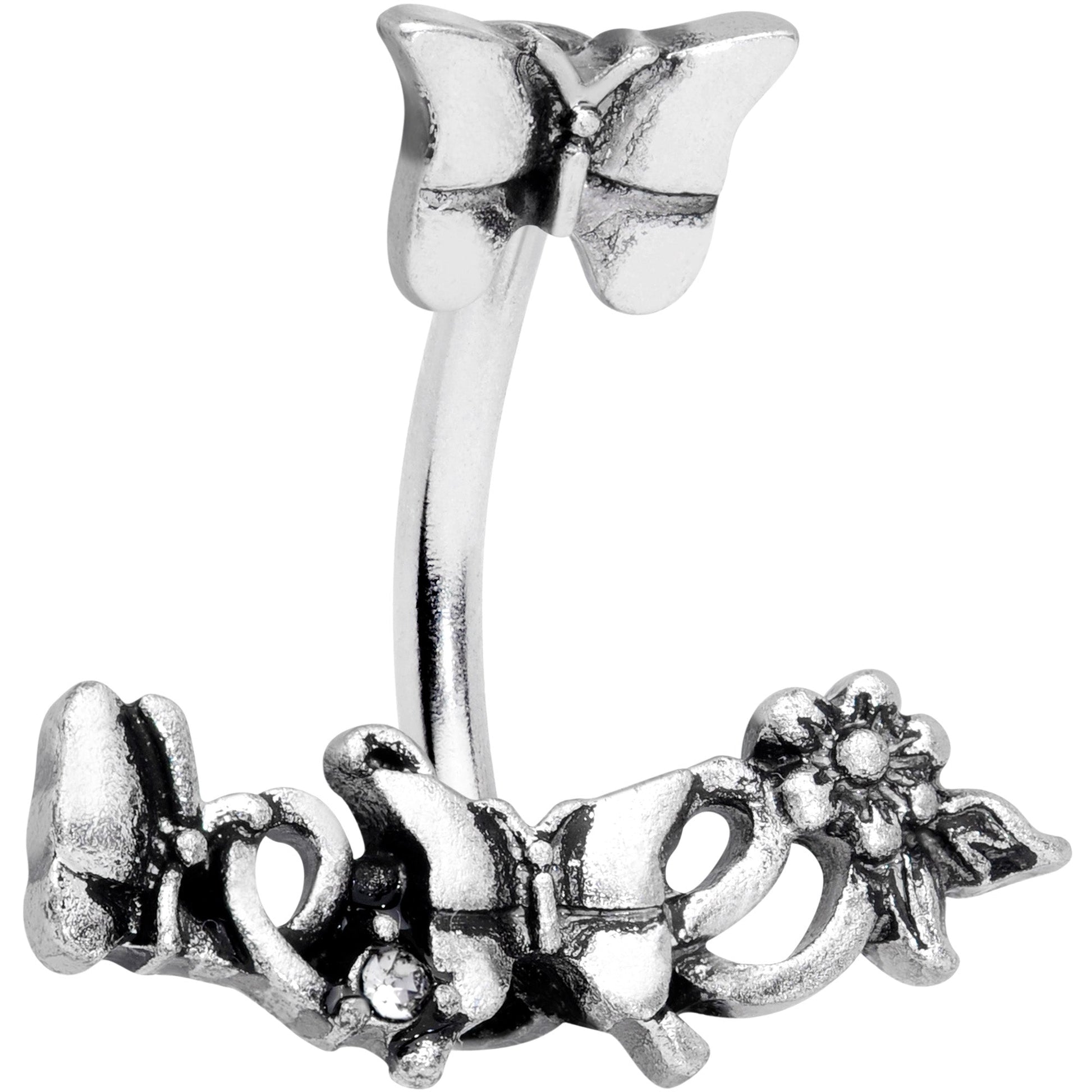 Hooray for the array of butterflies on this 14 gauge navel ring! It's made with a 3/8" durable 316L surgical grade stainless steel curved barbell. The top end features a single butterfly with simple detailing. The bottom end features a curving butterfly charm with a pair of butterflies and a single flower. It also features a single clear gem between the butterflies for an added touch of style. These butterflies are bound to beautify your belly button piercing!Specifications