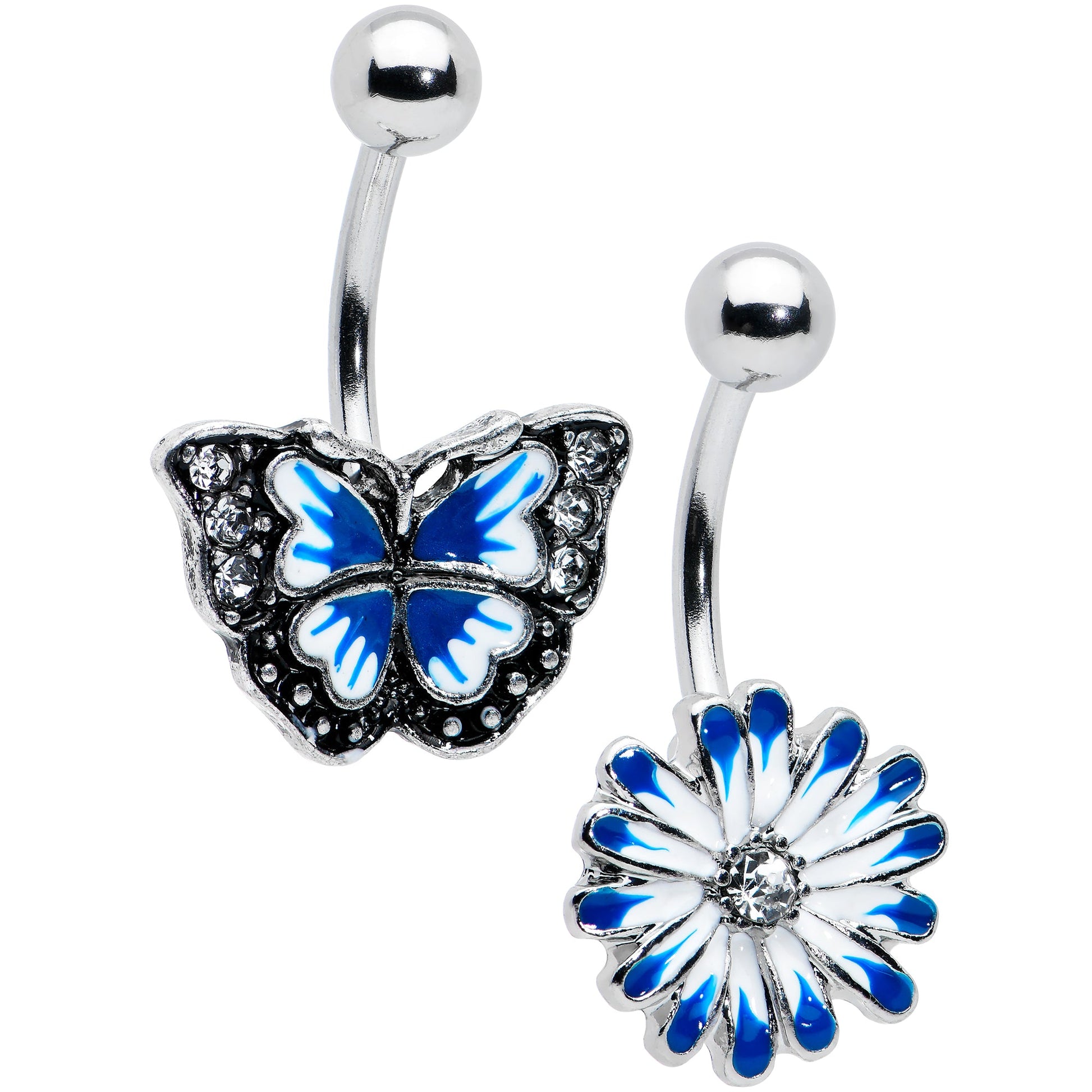 Clear Gem Butterfly Flower Blue White Belly Ring Set of 2