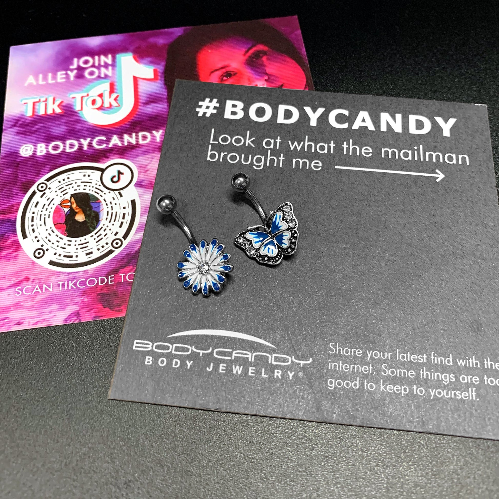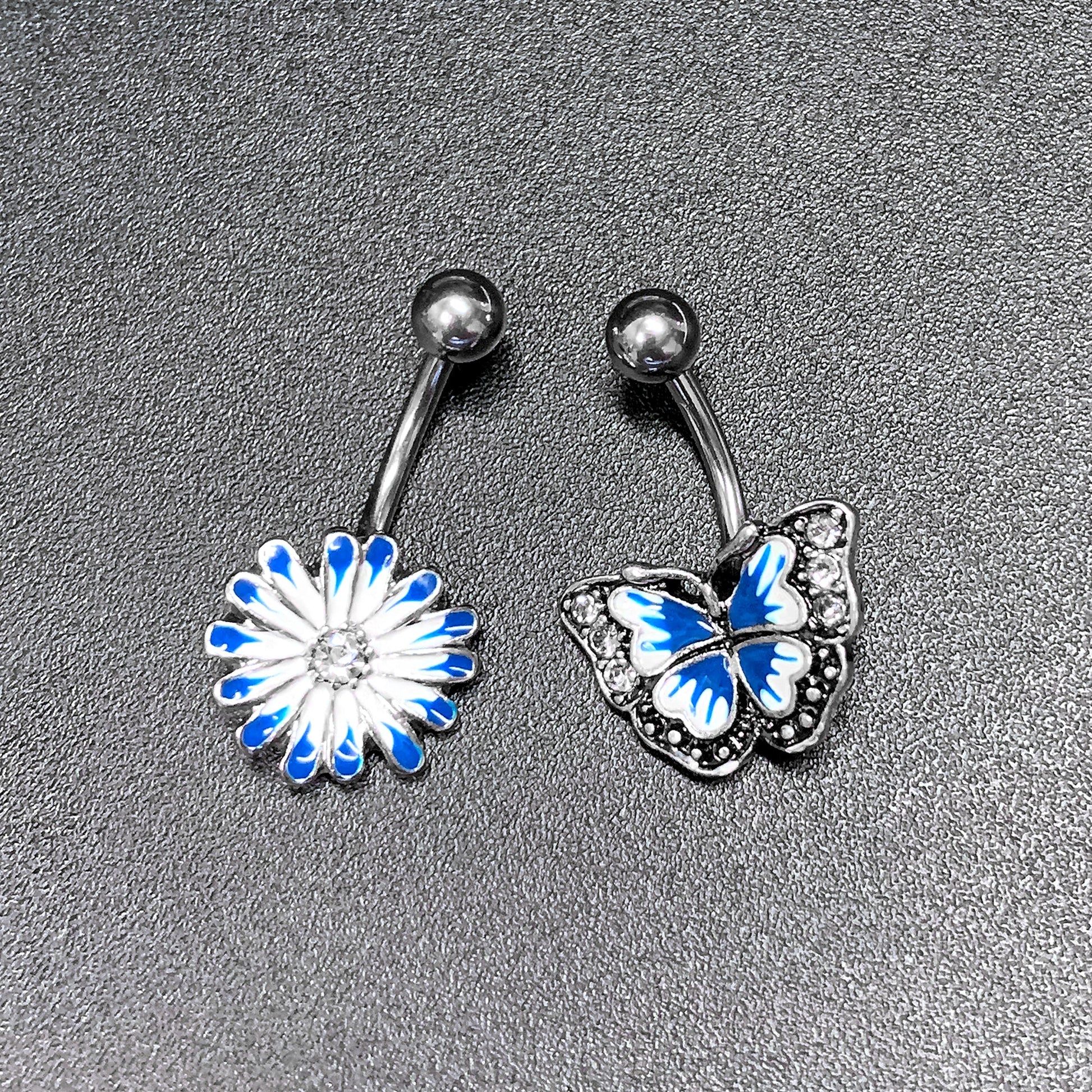 No matter what time of year it may be, these 14 gauge belly piercing rings will have you feeling like springtime! They're made with 3/8" durable 316L surgical grade stainless steel curved barbells with 5mm top ball ends. One features a flower charm, with blue and white detailing on the petals. The flower is further embellished with a clear gem at the center. The other navel ring features a butterfly charm, with blue and white detailing on the wings. The butterfly's wings are further embellished with clear gems along the edges. You'll be ready for sunshine and blue skies all year long with this gorgeous set of navel jewelry! Sold as a set of two.Specifications