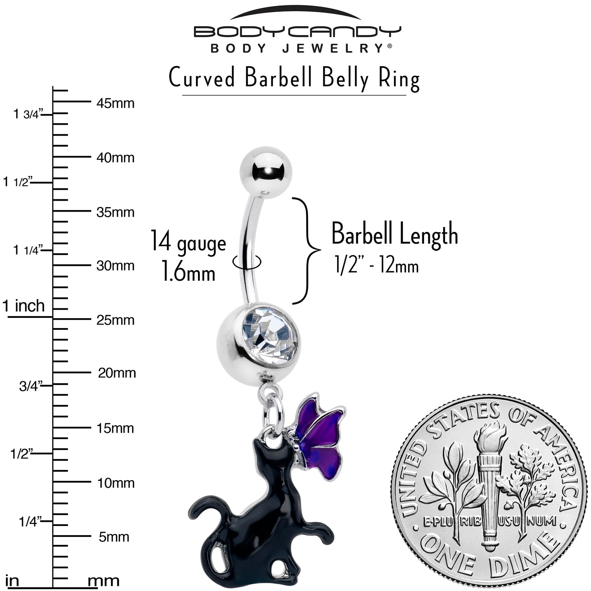 You'll feel as pretty as this kitty when you're rocking this 14 gauge navel ring. It's made with a 3/8 inch 316L surgical grade stainless steel curved barbell with a 5mm top ball end. The bottom ball end is 8mm and set with a clear gem. Dangling beneath is a sleek black cat charm, with a retro feel. The cat is nose to nose with a purple butterfly for a lovely touch of color. Get ready to purr when you're rocking this elegant belly piercing jewelry.Specifications