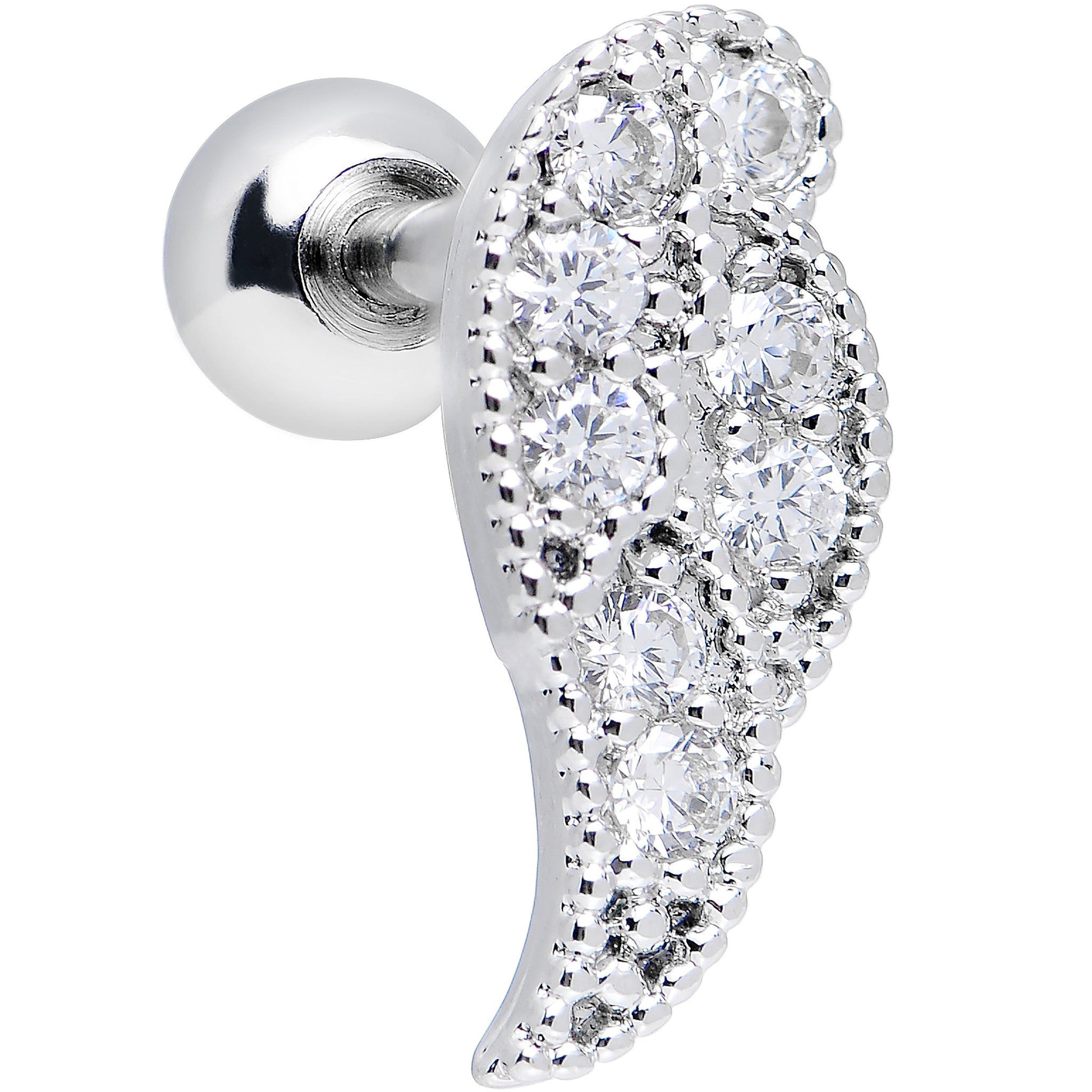 Never fly higher than your guardian angel can follow. Now there's no danger of that with this sparkling angel wing right ear cartilage tragus earring. A solitary clear gem studded wing is paired with a 16 gauge, 6mm stainless steel barbell to keep you on a heavenly path.