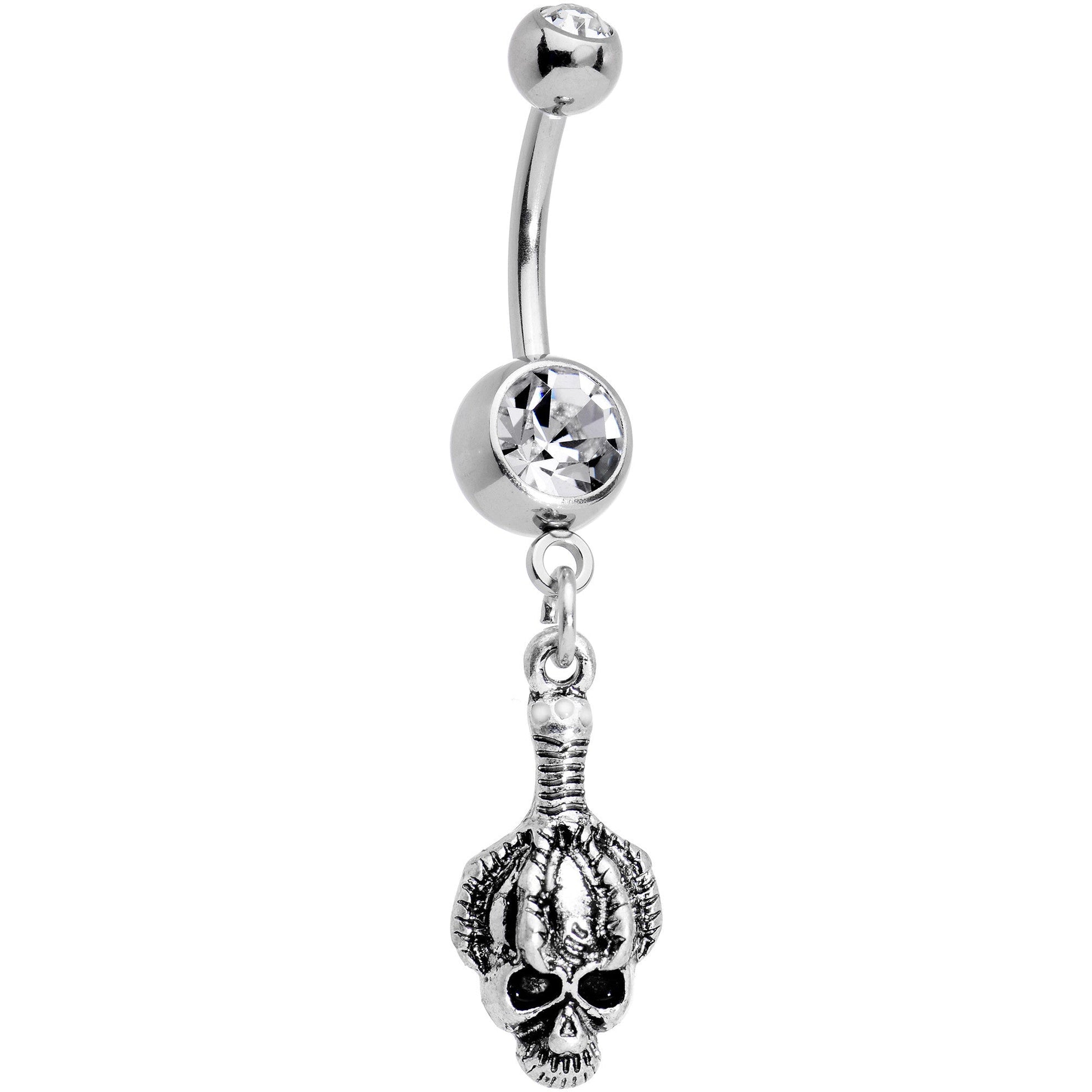 Clear Gem Creepy Shrunken Head Skull Dangle Belly Ring