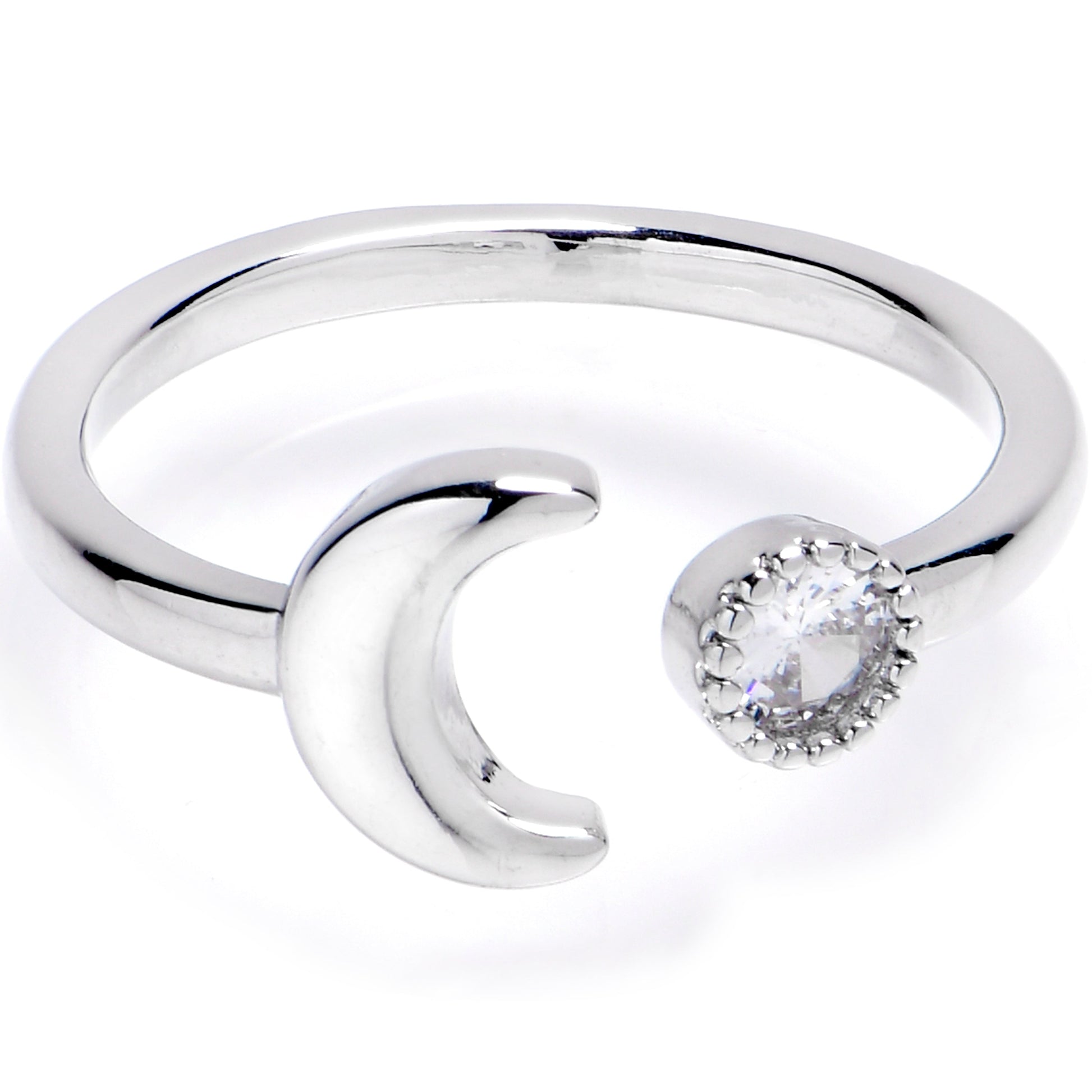 Let your look wax full of style with this celestial toe jewelry. Elevate your pedicure to a whole new level with our Adjustable Toe Ring, meticulously designed to accentuate the natural beauty of your feet and ensuring a perfect and comfortable fit. Its timeless design ensures it pairs seamlessly with any footwear, from sandals to sneakers, making it a must-have addition to your jewelry collection. This foot jewelry features a crescent moon charm end and a clear gem end for a look that is sure to make you a star.Specifications