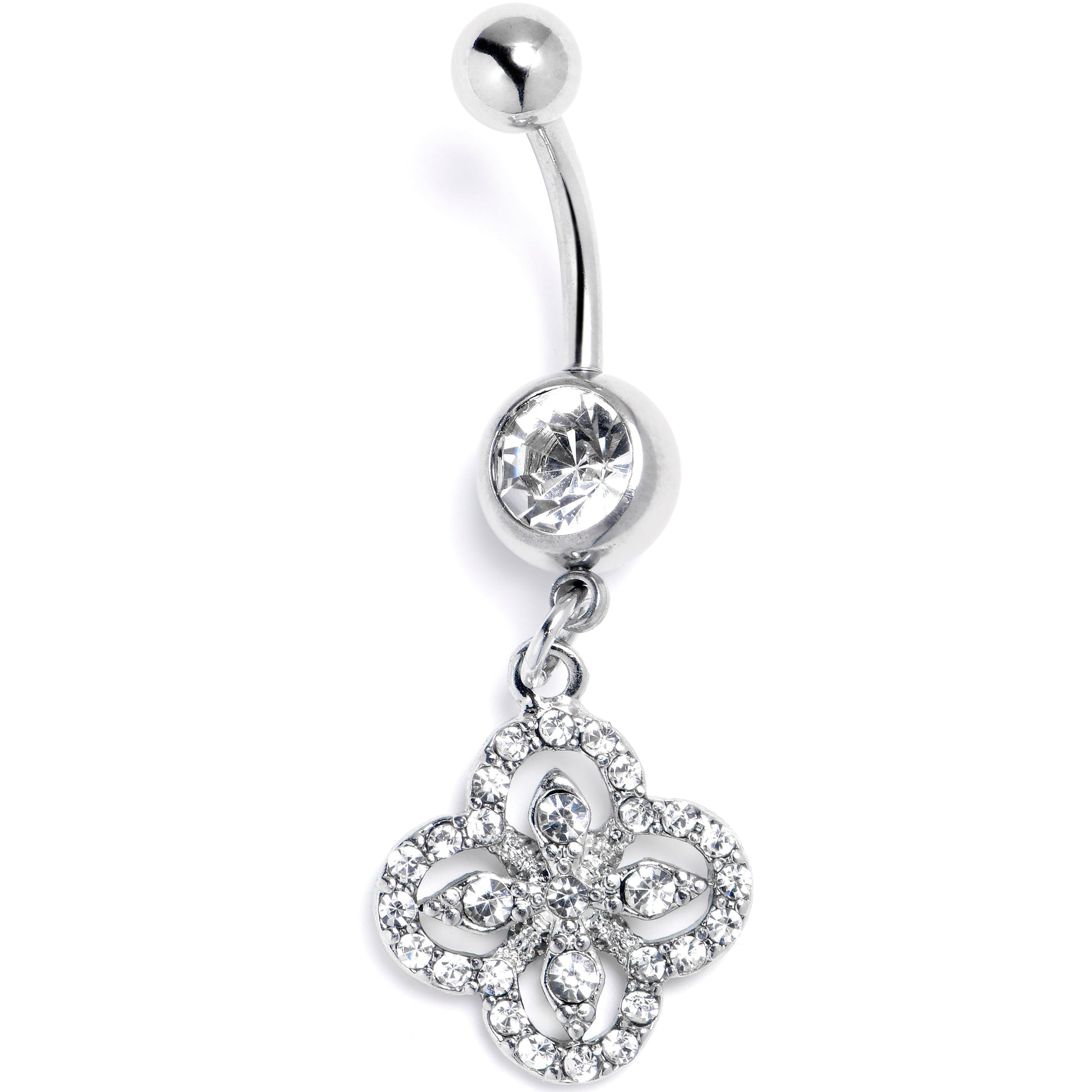 This stately, stylized 14 gauge navel ring adds an stylish touch to a spiritual piece. It is made with a 3/8 inch 316L surgical grade stainless steel curved barbell with a 5mm top ball end. The bottom ball end is 8mm and set with a clear gem. Dangling beneath is a stylized cross charm, with a curved, openwork design that's embellished with clear gems throughout for a touch of cohesive elegance that truly gives this piece a stylish feel. Once you have this belly piercing jewelry in, taking it out will never cross your mind.Specifications