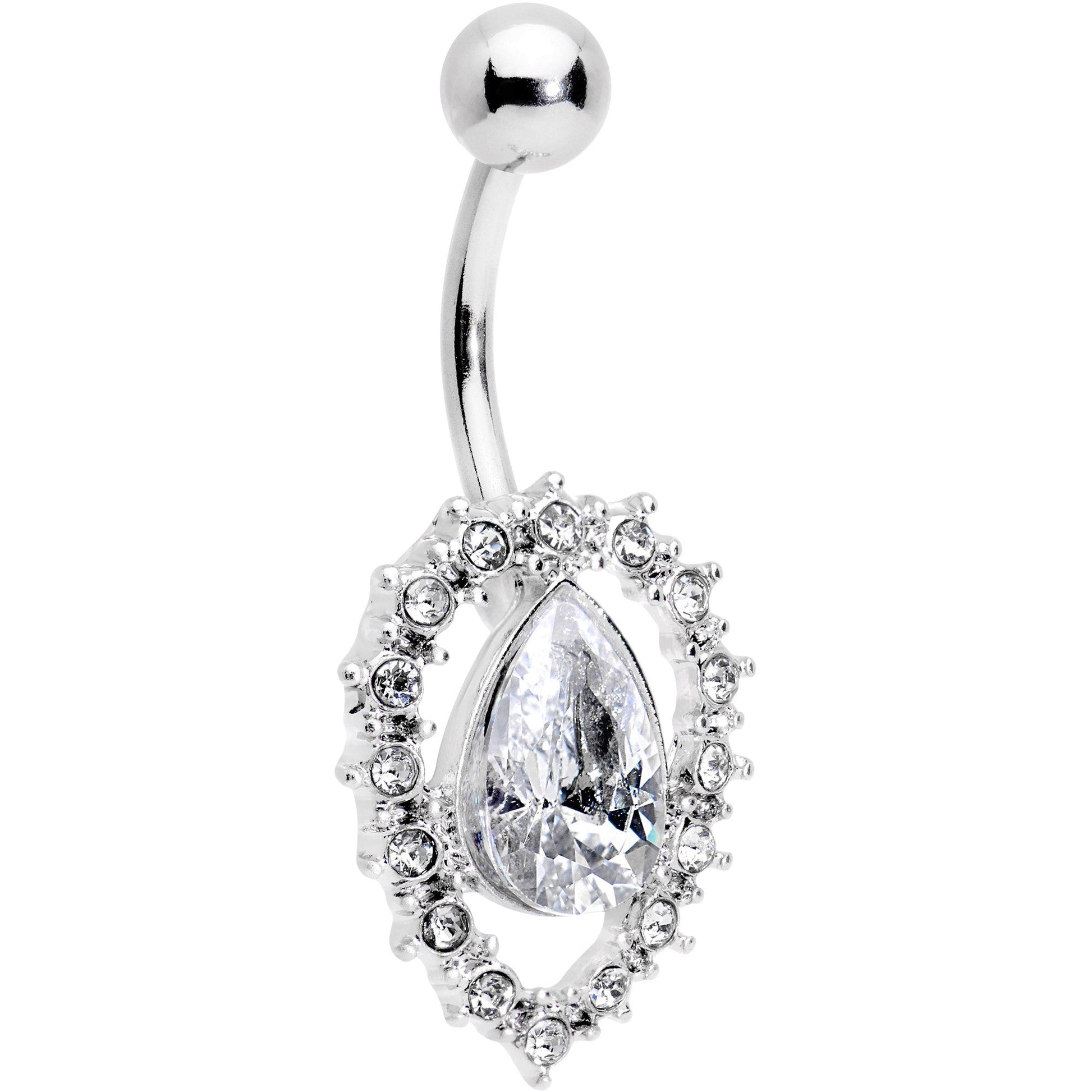 If you are ready to announce yourself as the debutante of life's ball everyday wherever you go then this 14 gauge belly button ring is a great choice. Made with a 7/16" durable 316L surgical grade stainless steel curved barbell, this navel peircing features a bottom charm made of a large single clear drop shaped gem surrounded by a frame of clear gems for decadent beauty.