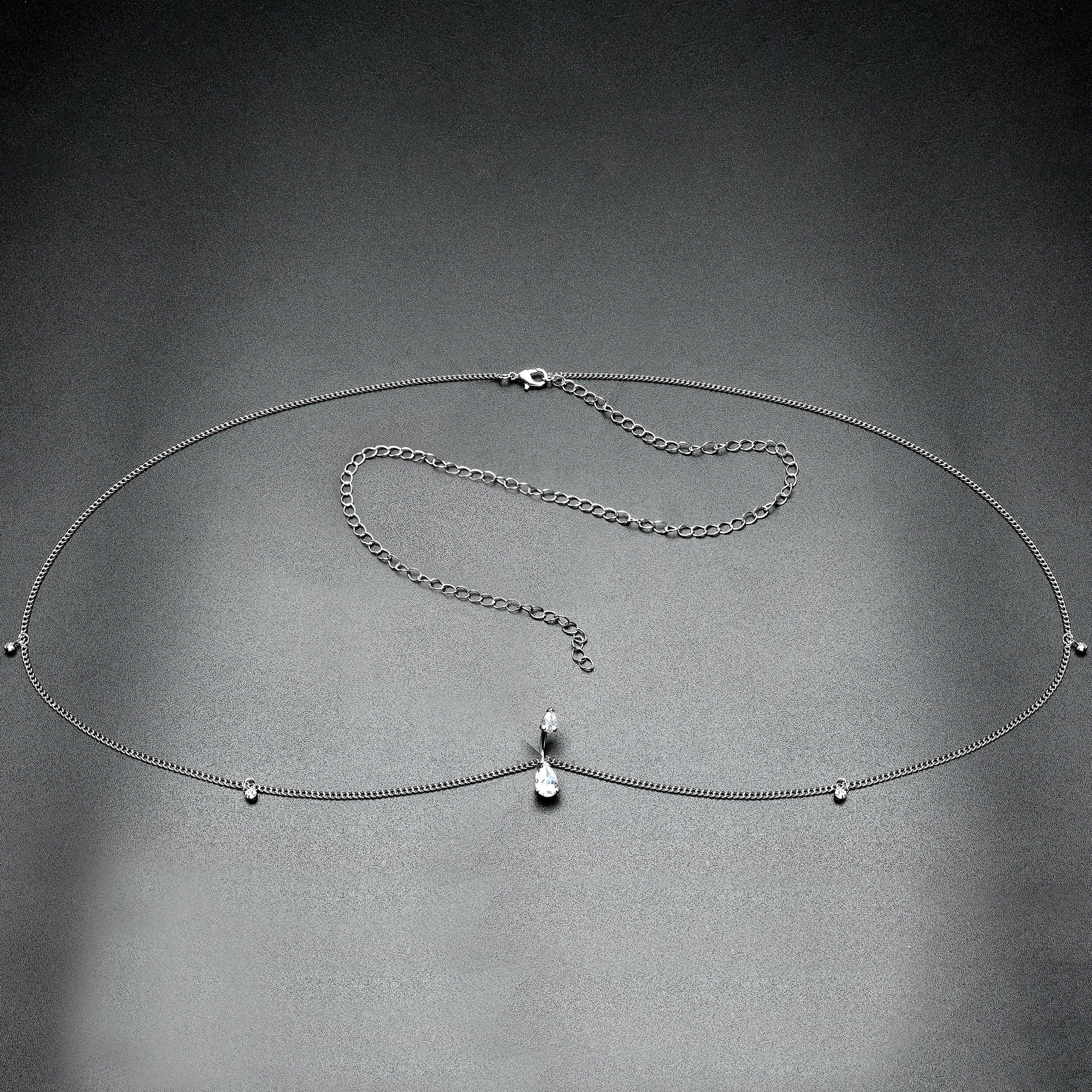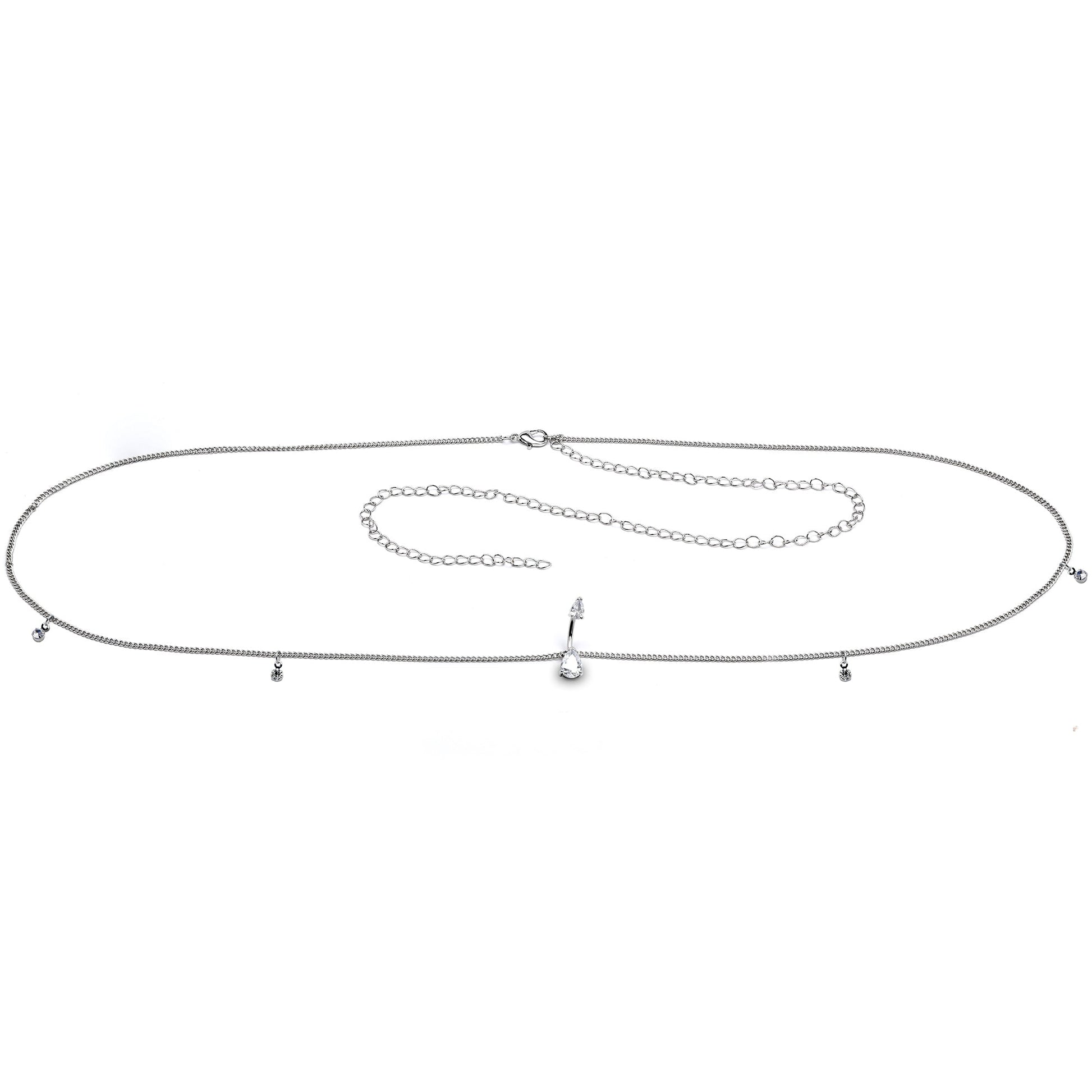 Don't let your midriff go bare when you wear your favorite halter top or belly shirt. This sexy belly chain jewelry is attached to a 14 gauge double mount navel ring made with a 3/8" durable 316L surgical grade stainless steel curved barbell. The top end features a clear gem drop while the bottom is composed of a matching clear gem drop. This belly piercing jewelry features a 29.5"-44" chain length waist belt as well as clear gem dangle charms. The waist chain features a lobster clasp used to adjust the length to fit your body.Specifications