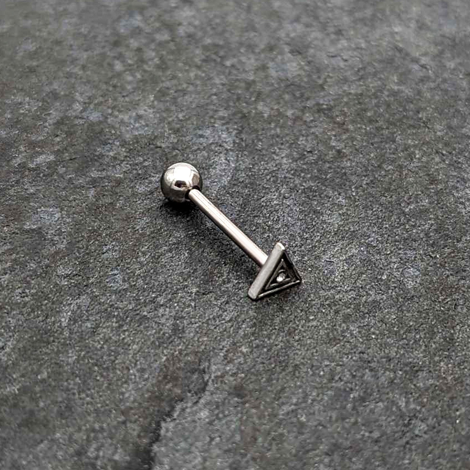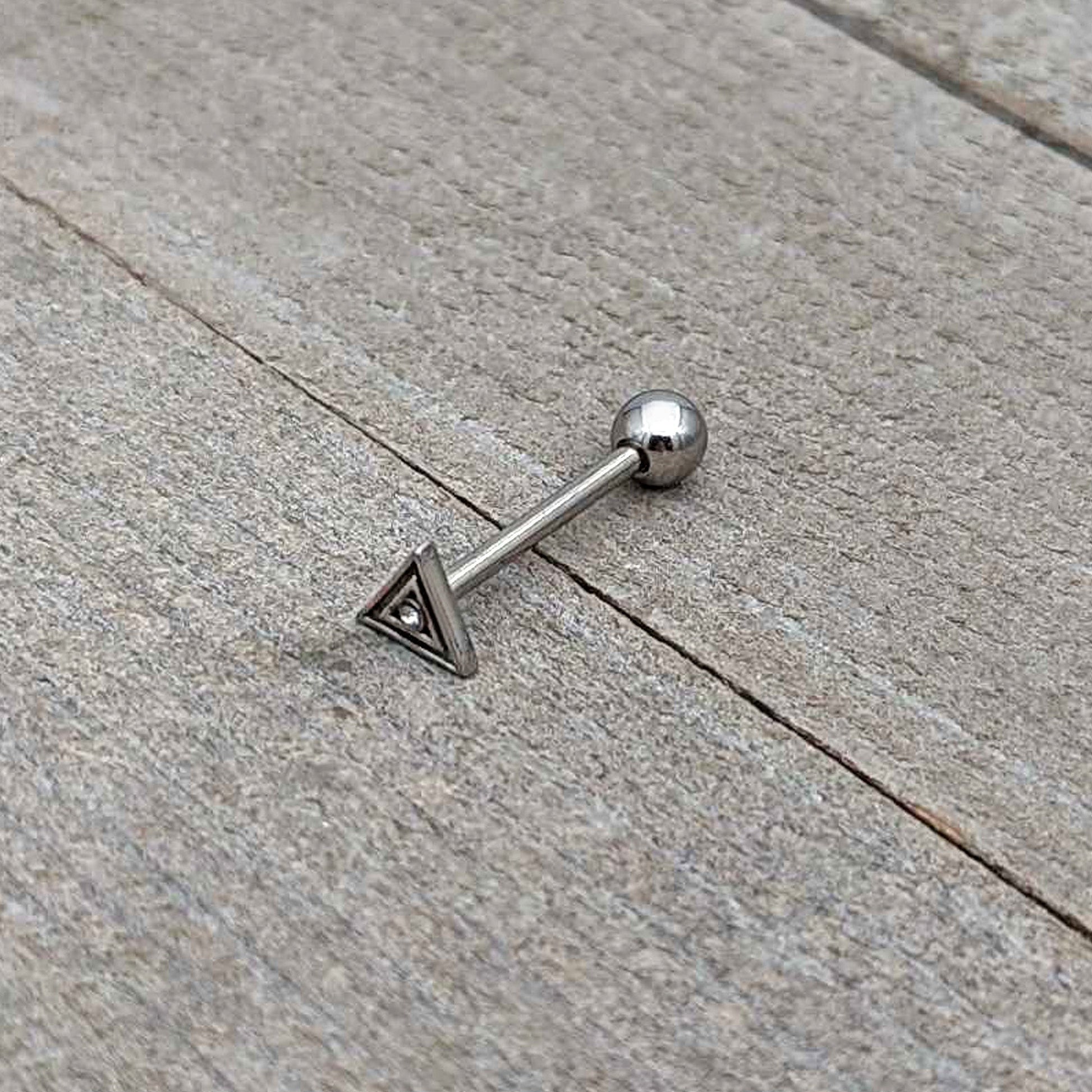 Sometimes we want our look to speak softly - like on this 14 gauge tongue jewelry! It's made with a 5/8" durable 316L surgical grade stainless steel straight barbell with a 5mm bottom ball end. The top end features an understated charm of a pair of triangle nestled within one another. At the very center of the pair sits a clear gem for a low-key pop of style. For a look that says volumes without overwhelming, this tongue piercing ring is all you'll need!Specifications