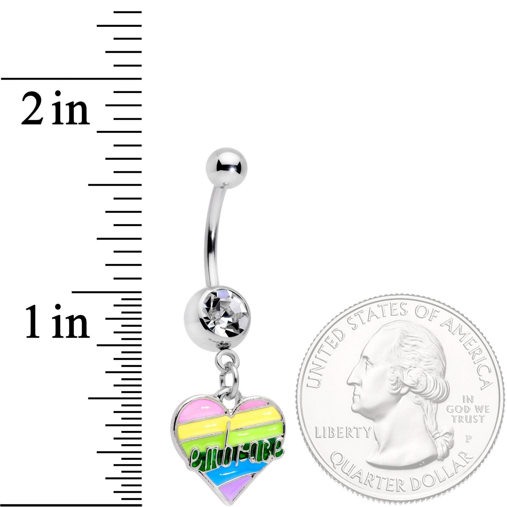 Show the world that you embrace differences in all people when you wear this 14 gauge navel ring. Made with a 7/16" durable 316L surgical grade stainless curved barbell, this belly button ring features a clear bottom gem with a pastel rainbow heart dangle charm that says "embrace" so you can show your support for all.Specifications