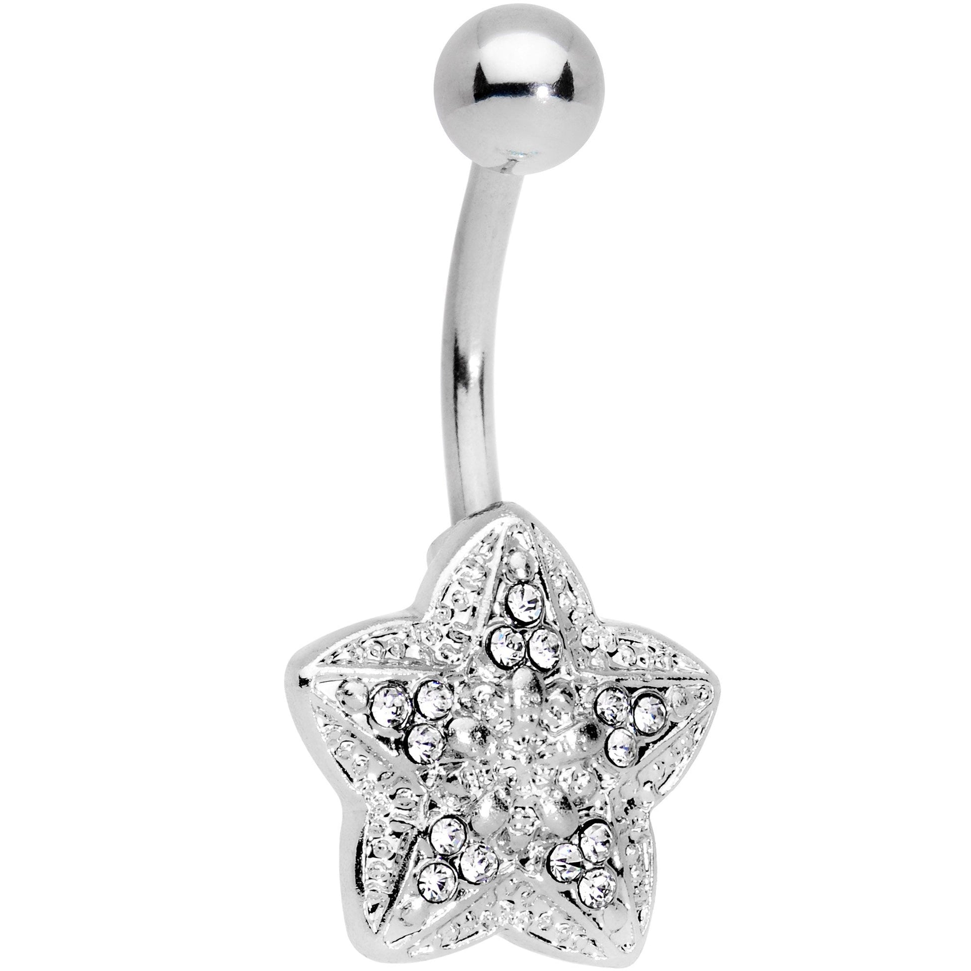 This delightfully chunky star charm is encrusted in beautiful clear gems. This 14 gauge belly button piercing features a rounded-edge star charm covered in beautiful clusters of gems. The star charm is mounted on a 7/16" curved barbell made with durable 316L surgical grade stainless steel.