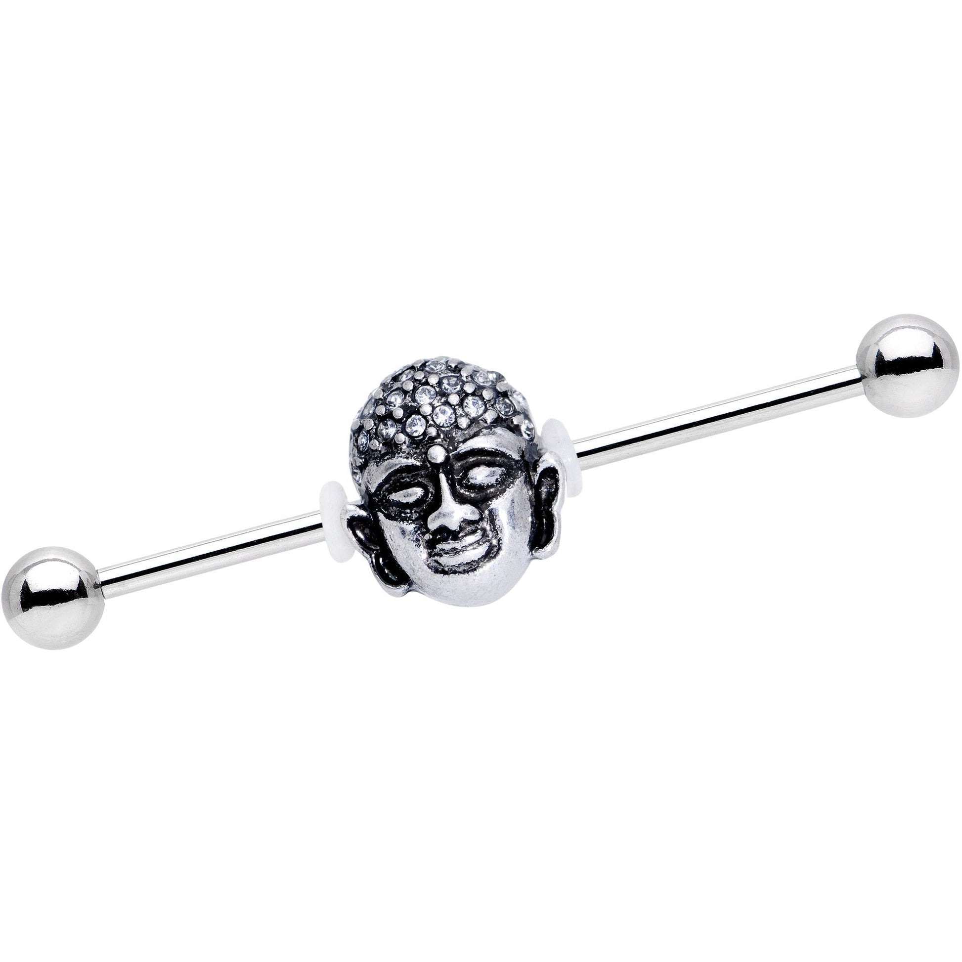 This Buddha's mind is so expansive, you can see it's universal knowledge! The moveable Buddha charm on this 14 gauge industrial barbell piercing is encrusted with a universe of clear mini gems. Mounted on a 1 1/2" straight barbell made with durable 316L surgical grade stainless steel, this moveable Buddha charm is your next step toward finding inner peace.