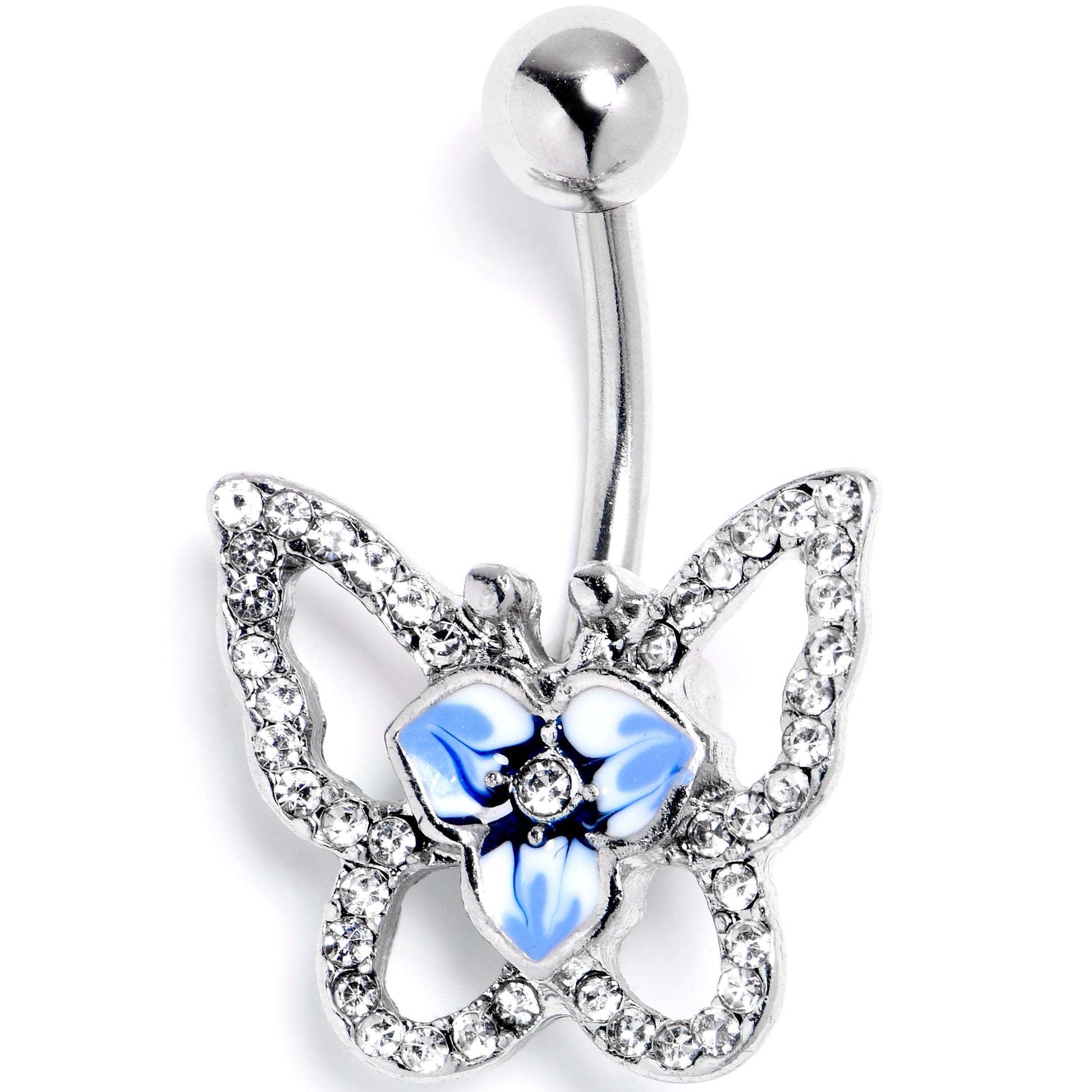 Get fabulous and floral with the butterfly on this 14 gauge navel ring. It is made with a 3/8 inch 316L surgical grade stainless steel curved barbell with a 5mm top ball end. The bottom features an openwork butterfly charm, completely paved in clear gems. At the center of the butterfly is a blue flower for major color contrast and another clear gem at the center for a cohesive look. You will be feeling absolutely fabulous when you are rocking the floral butterfly on this opulent belly piercing jewelry.Specifications