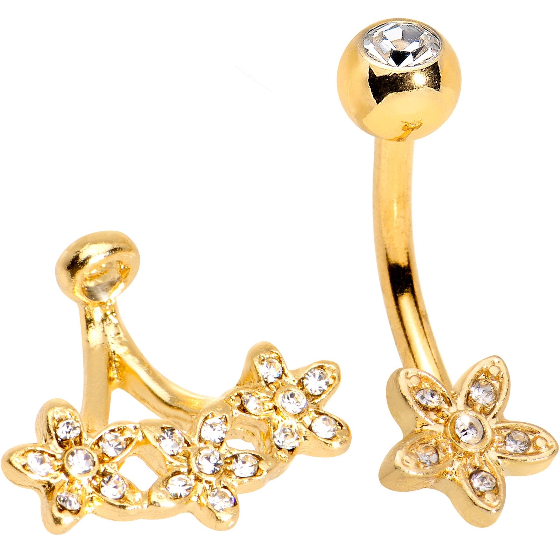 Wow, smell those freshly cut flowers! This beautiful 14 gauge dangle belly ring features a whole field of beautiful flowers! A trio of five petal flowers encrusted with clear gems is mounted on a 7/16" curved barbell made with gold PVD over 316L surgical grade stainless steel complete with a flower charm bottom accent and a top clear gem ball. Upgrade your belly button jewelry with this glamorous piercing today!