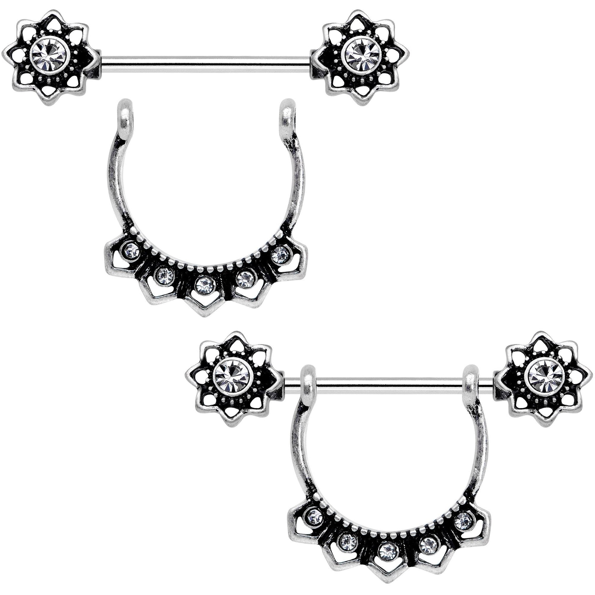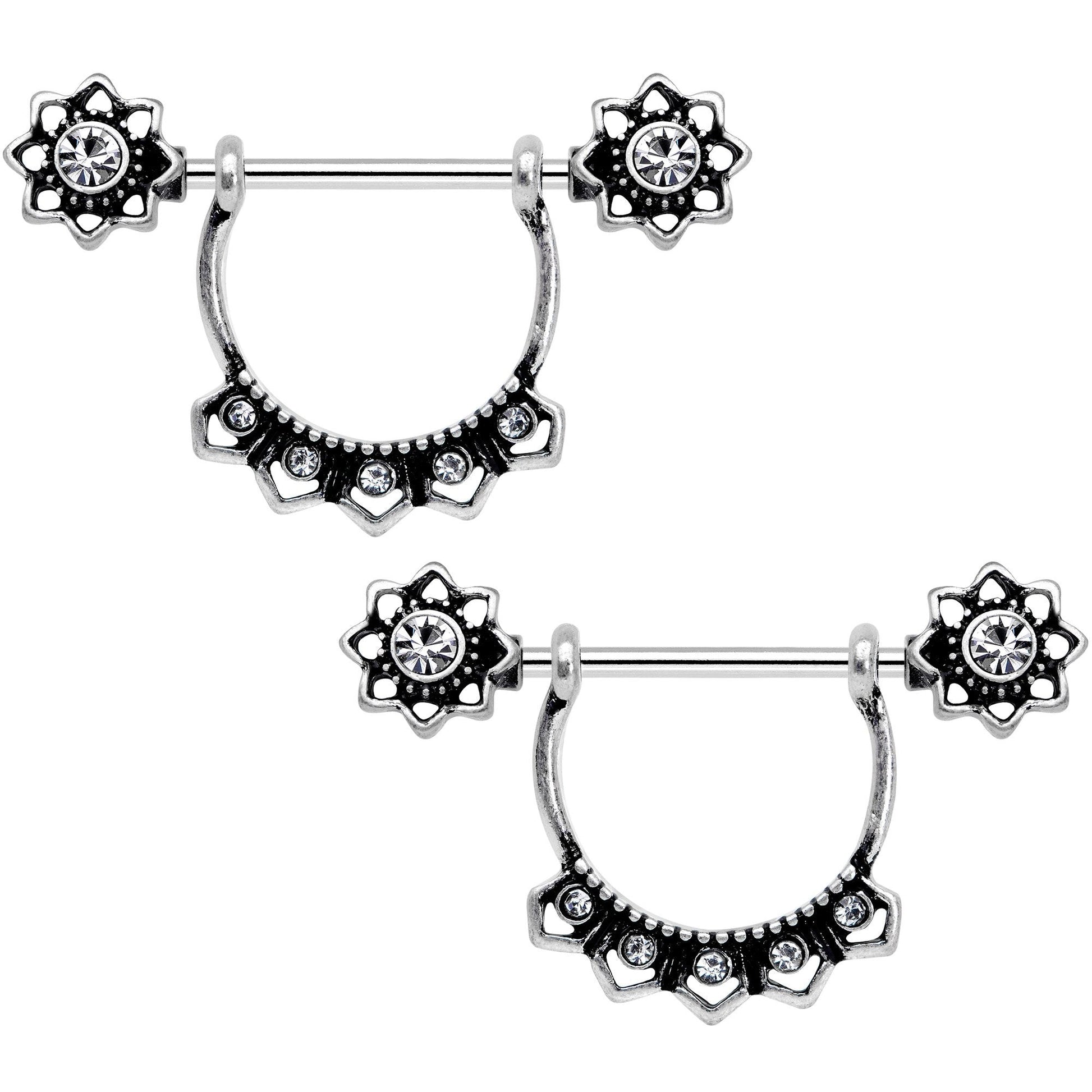 These unique, 1920s flapper fashion-inspired nipple rings can be worn in two different ways! Wear them with the clear gem encrusted dangle, or remove the dangle and wear them like a standard set of barbells, complete with starry clear gem ends. The clear gem starry charms and dangles on these 14 gauge nipple rings are set on a pair of 3/4" straight barbells made with durable 316L surgical grade stainless steel. Sold as a set of two!