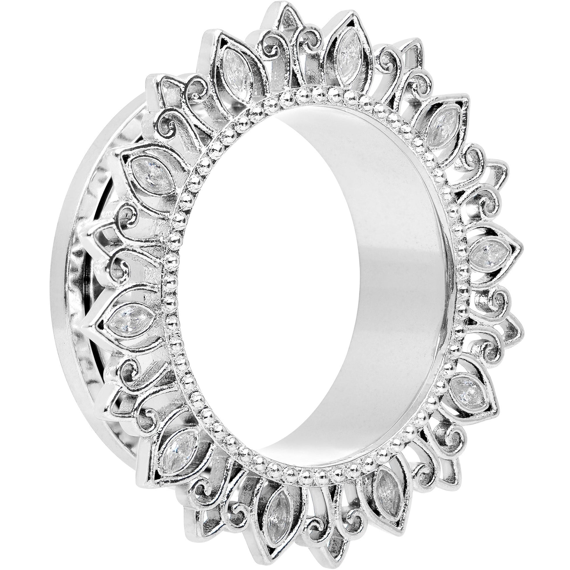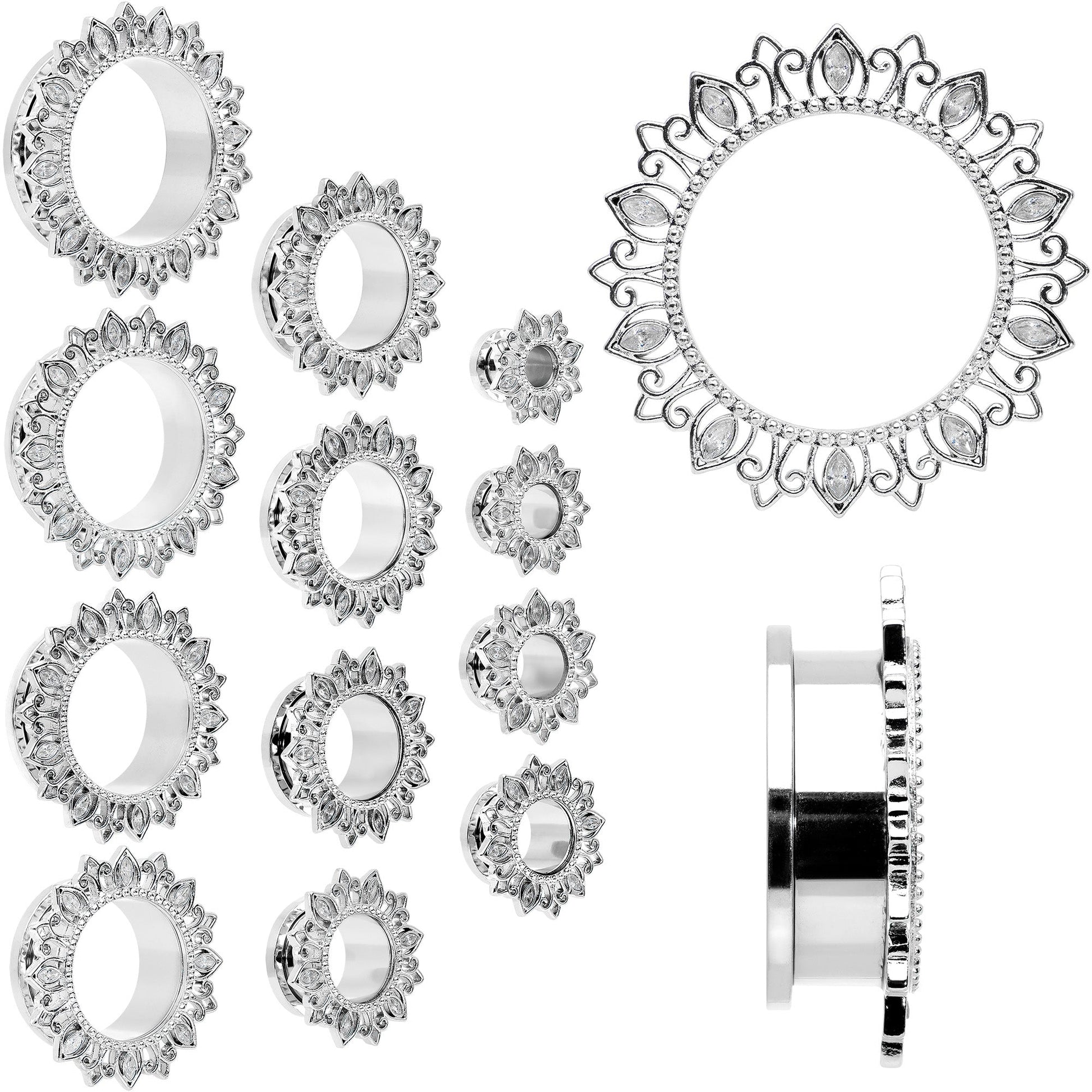 Get a fantastically floral look without losing your edge with these tunnel plugs for your stretched lobes! They're made with durable 316L surgical grade stainless steel and feature a screw fit design that makes them easy to insert and remove. The front features an ornate, floral-inspired flare with fleur-de-lis embellishment all around the tunnel portion. The flare is further embellished with several clear oval gems for a cohesive look that will knock your socks off! Add a little edge to your look with these fashionable, floral tunnel plugs! Sold as a set of two.Specifications