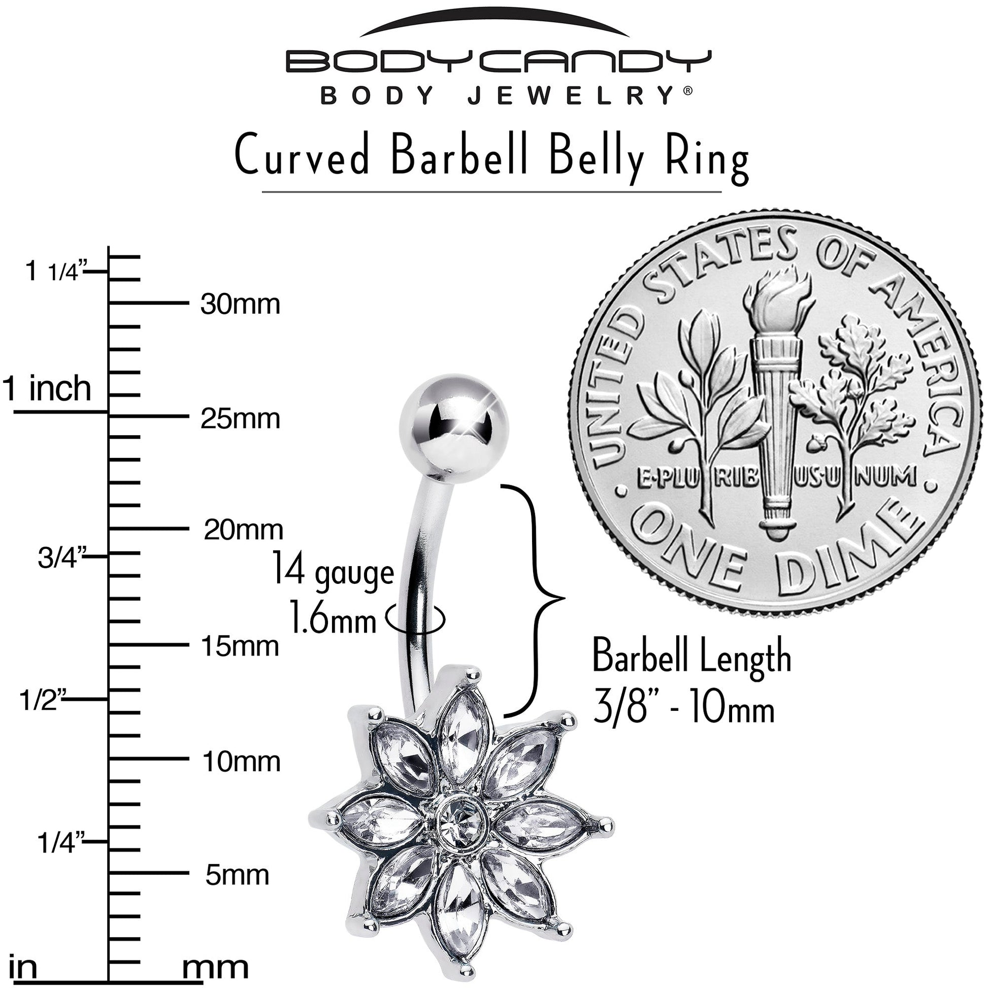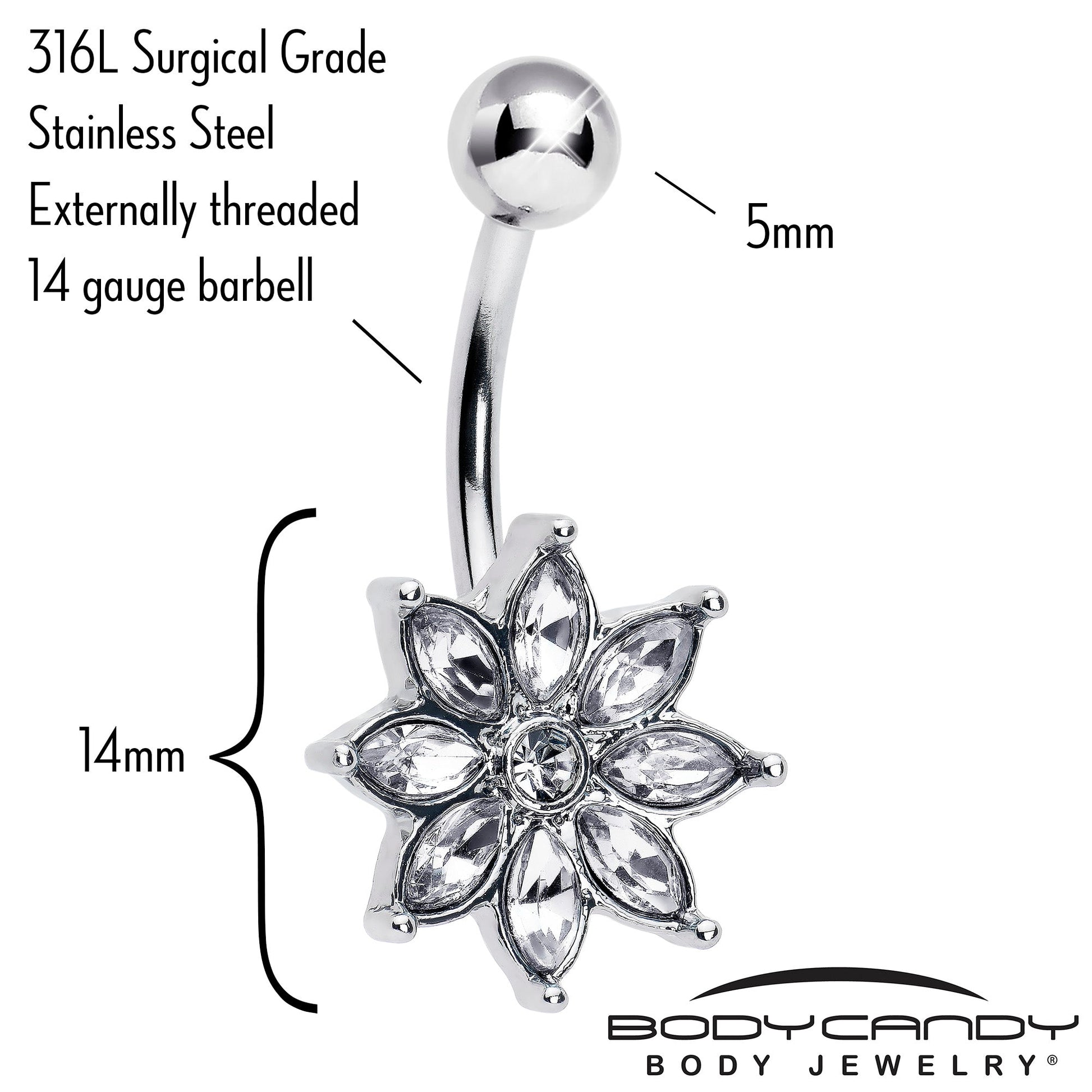 The flower on this 14 gauge navel ring is sure to make your heart bloom. It is made with a 3/8 inch 316L surgical grade stainless steel curved barbell with a 5mm top ball end. The bottom end features an intricate floral charm composed of clear gem petals for an elegant look. It is further embellished with a matching clear gem center in for a powerful punch of style. Let a blooming flower spruce up your look with this sweetly elegant belly piercing jewelry.Specifications