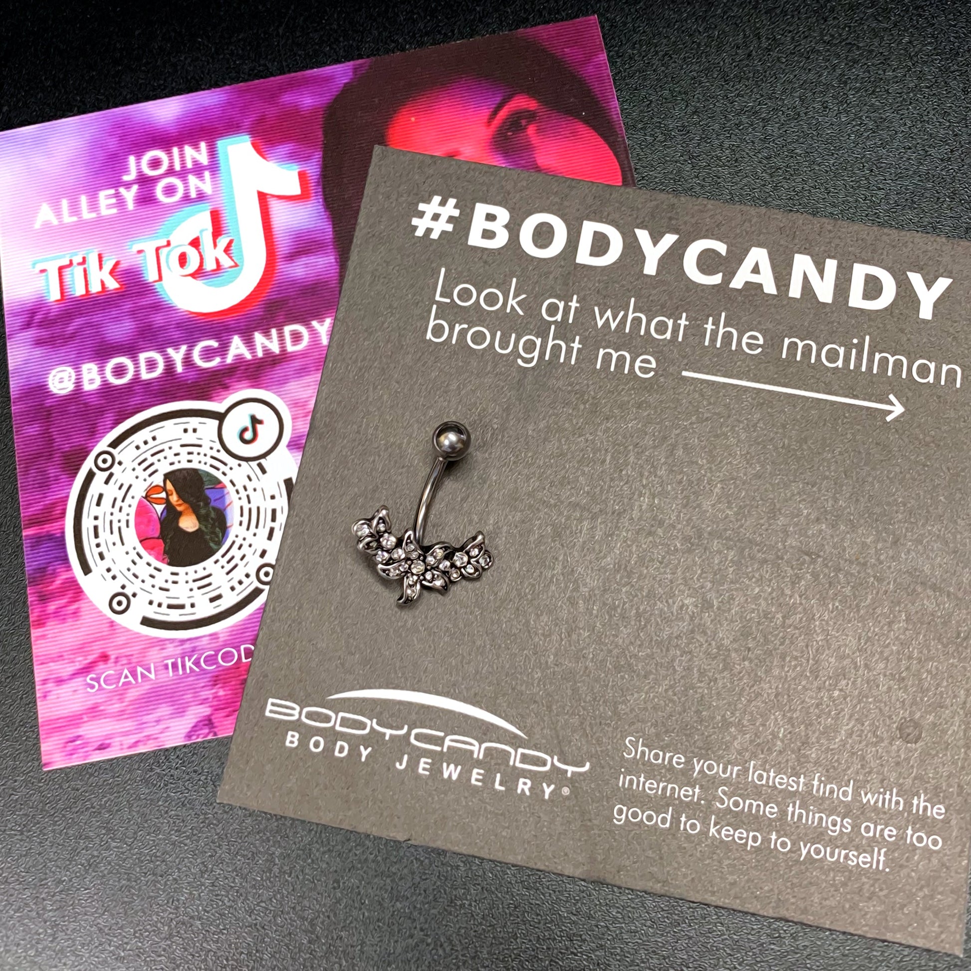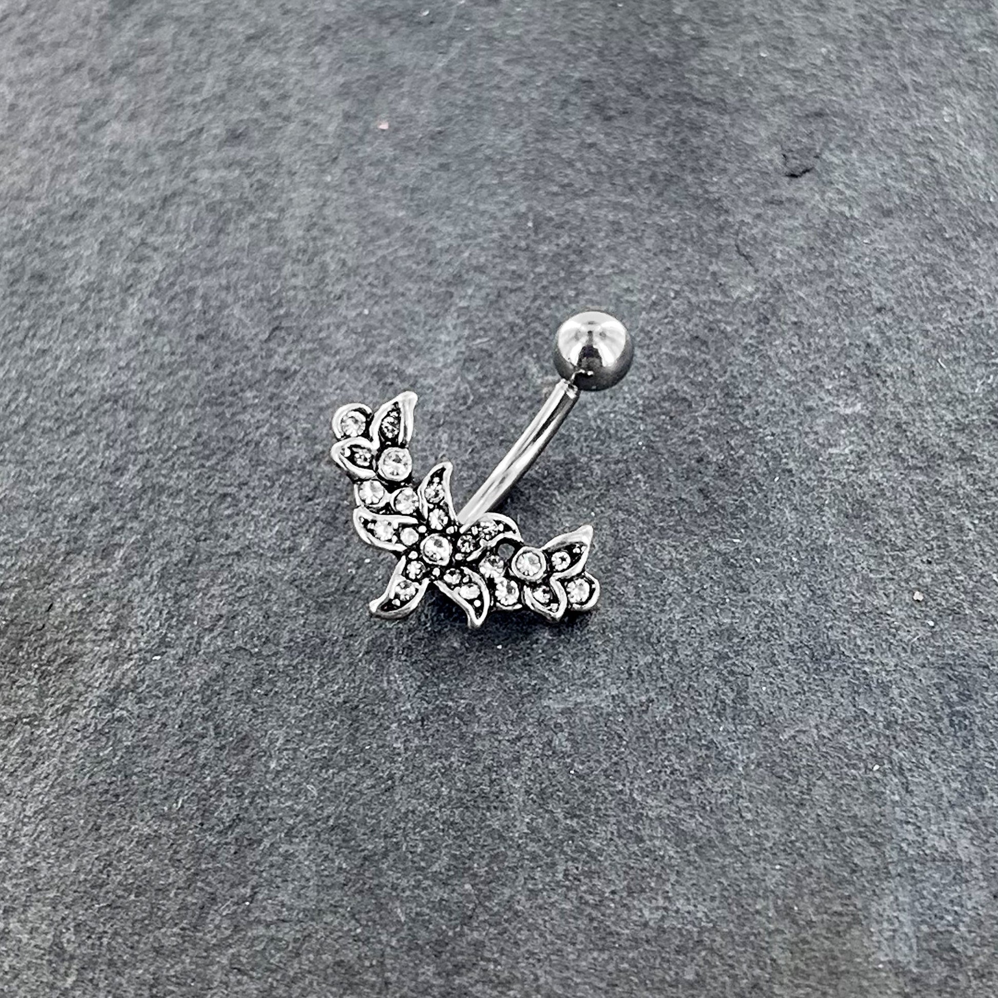 Frolic in the flowers with this 14 gauge navel ring! It's made with a 3/8 durable 316L surgical grade stainless steel curved barbell with a 5mm top ball end. The bottom end features a flower charm, with a large central flower flanked by a pair of smaller flowers. All of the flowers are paved with clear gems for a thoroughly glam look. You'll be ready to bloom when you're rocking this fabulously floral belly piercing ring!Specifications