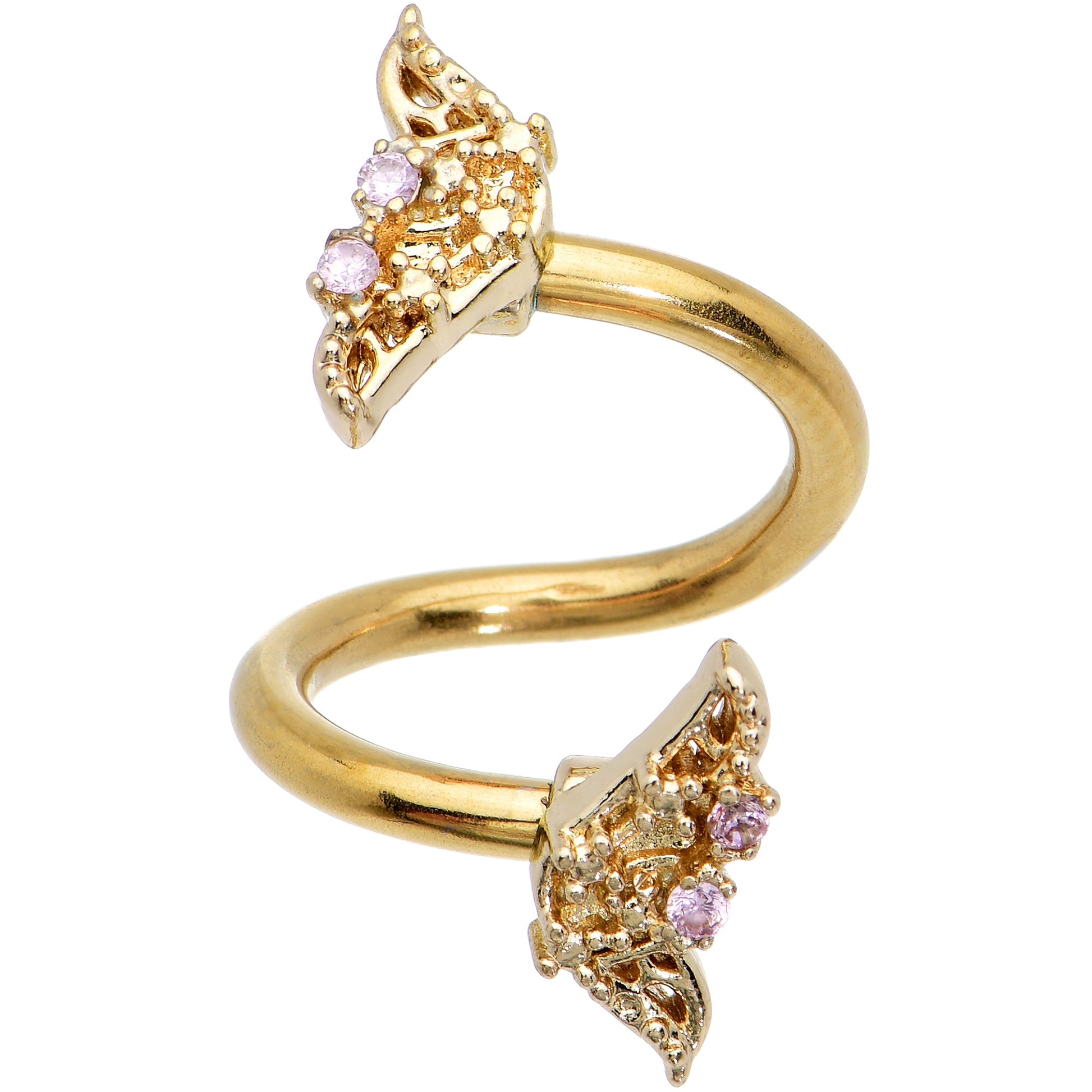 Spread your wings with this 14 gauge belly button ring! It's made with a 3/8" gold tone PVD over 316L surgical grade stainless spiral curved barbell. The ends each feature a single butterfly wing, with intricate detailing for an elegant look. Each wing is set with two clear gems and can be worn in multiple piercings including the belly button, lip, some eyebrow piercings, and some cartilage piercings such as the helix. Let your look soar with the wonderful wings on this navel ring!Specifications