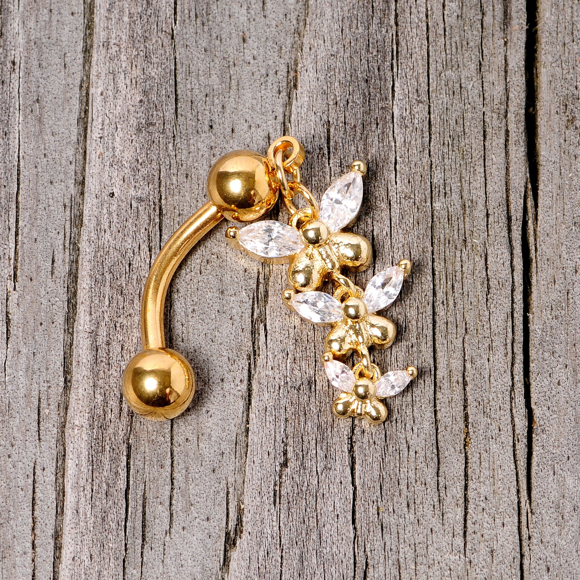 These butterflies all want to hang together...and do so on this gorgeous 14 gauge navel jewelry! It's made with a 3/8" gold tone plated over 316L surgical grade stainless steel curved barbell with 5mm ball ends. It features a butterflies dangle charm that hangs from the top ball end, with wings set with clear gems. Combined with the way they sway with the motion of your body, these butterflies are sure to catch the eye! Let these beautiful butterflies beautify your belly button piercing!Specifications