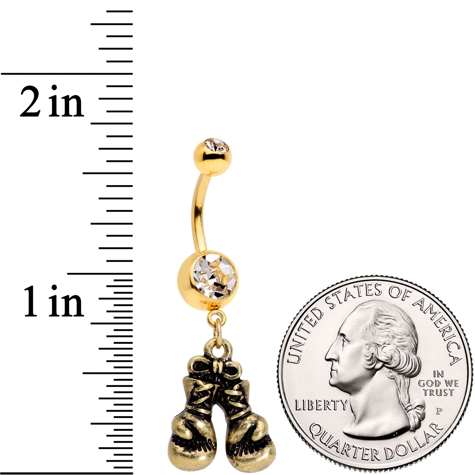 Boom! Boom! This navel ring is a total knockout! The 14 gauge belly button ring is made with a 3/8" gold tone PVD over 316L surgical grade stainless steel curved barbell. It has a 5mm top ball end and an 8mm bottom ball end, both set with clear gems. Dangling from the base is a pair of boxing gloves charm that can swing freely with your body's motion. After all, any boxer knows it's all in how you move! This navel jewelry is sure to have you seeing stars!Specifications