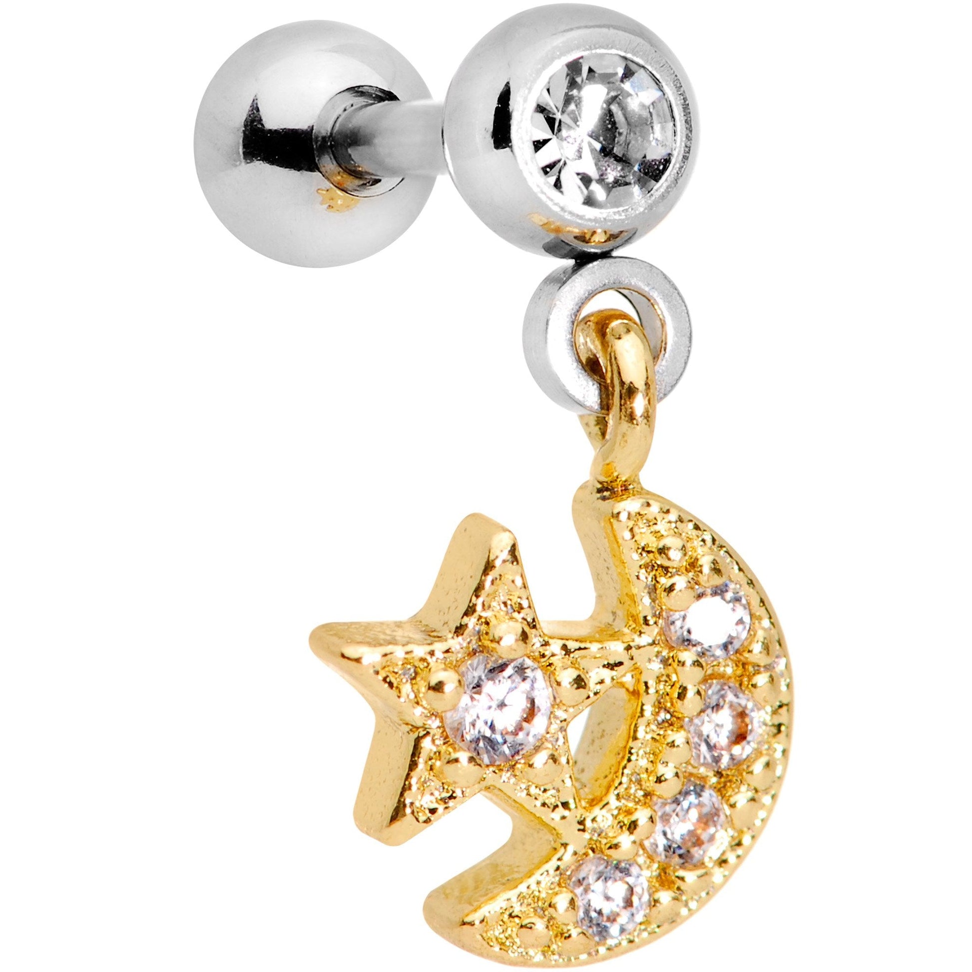 This moon and star duo is bound to be the brightest in the sky. That's because they both sparkle with a universe of clear gems. A gold tone moon and star charm is the centerpiece of this fun 16 gauge cartilage piercing. The moon and star charm dangles from a 6mm in length durable 316L surgical grade stainless steel straight barbell complete with a clear mini gem ball for that extra bit of twinkle!Specifications
