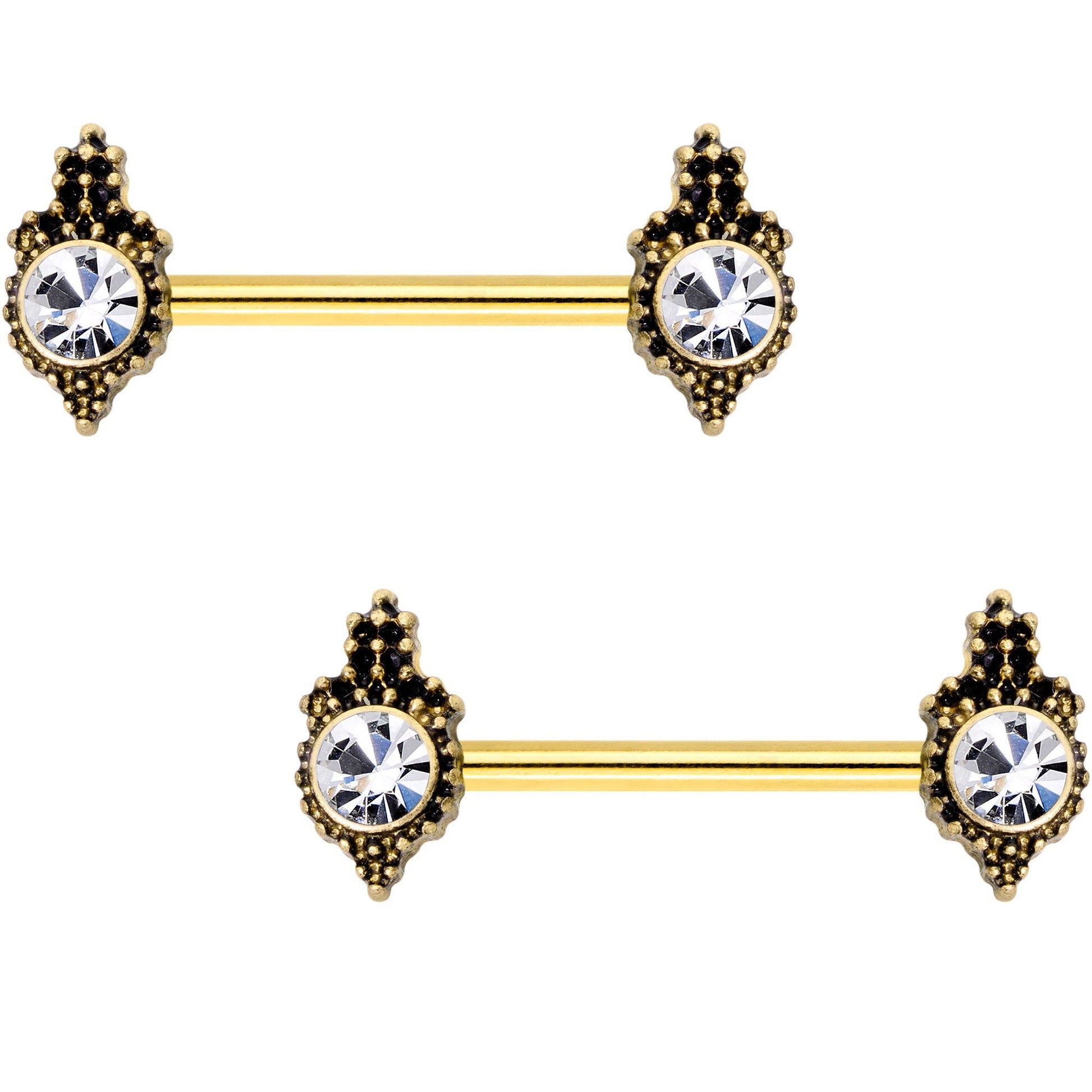 Simple yet elegant, these pretty, Southwestern fashion nipple barbells are understated and unique. The sparkling, front facing clear cubic zirconia gem ends framed by a Southwestern-inspired design to make for a perfect touch of style. The clear gems are mounted on a 9/16" straight barbell made with gold tone anodized over 316L surgical grade stainless steel. Feel as classy as you are with these pretty nipple piercings! Sold as a set of two.Specifications
