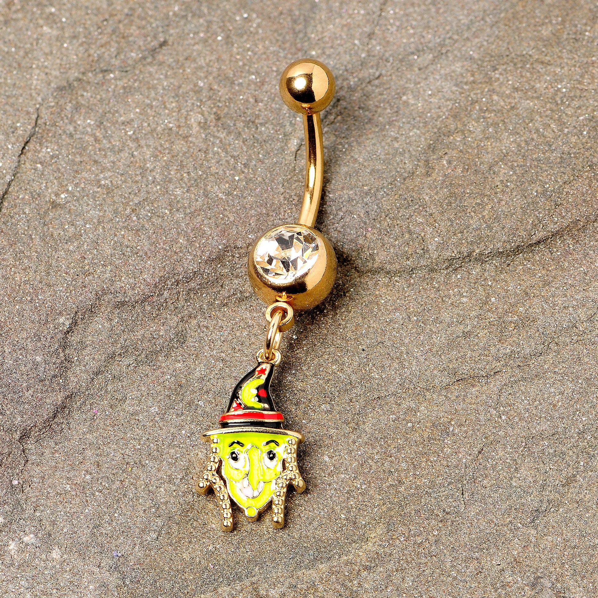 Clear Gem Gold Tone Green Witch Halloween Dangle Belly Ring
