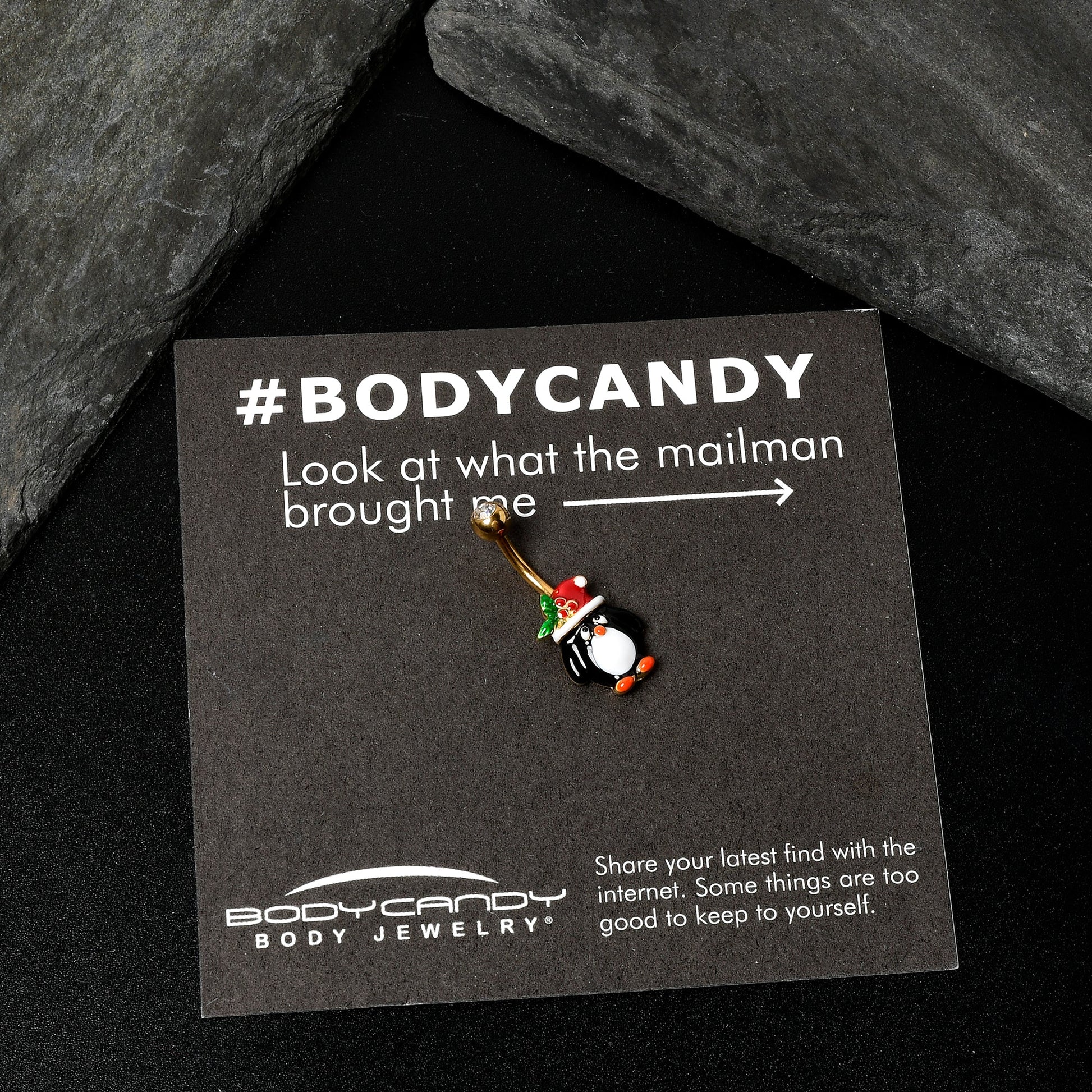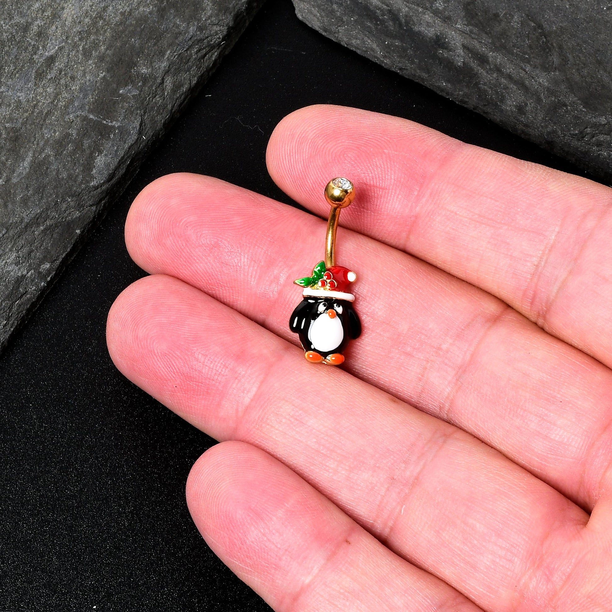 You want to dress to impress for the holidays, like the penguin on this 14 gauge navel ring! It's made with a 3/8" gold tone PVD over 316L surgical grade stainless steel curved barbell with a 5mm top ball end. The ball end is set with a clear gem. The bottom end features a penguin charm, with the penguin rocking its traditional black and white. The penguin is also sporting a festive Santa cap, embellished with a sprig of holly. You'll be rocking your finest when you're rocking this merry penguin belly piercing jewelry.Specifications