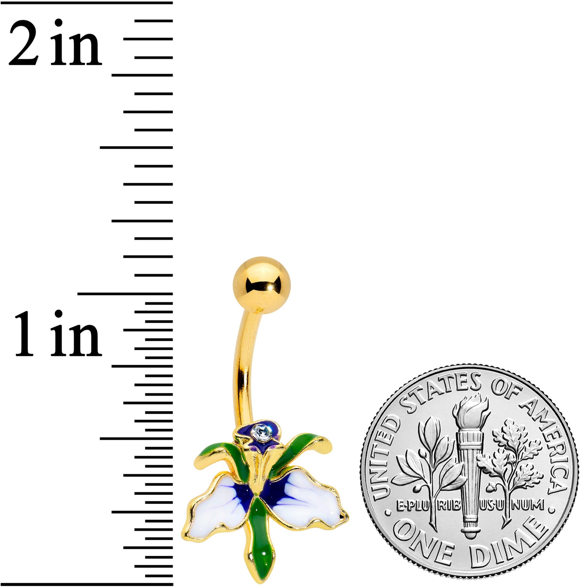 Let every day feel like Springtime when you're rocking this 14 gauge navel ring! it's made with a 3/8" gold tone PVD over 316L surgical grade stainless steel curved barbell with a 5mm top ball end. The bottom end features an iris flower charm, inlaid in purple and white. It's further embellished with green leaves and is set at the top with a clear gem for added style. Your look is going to blossom with this fantastic, floral belly piercing ring!Specifications
