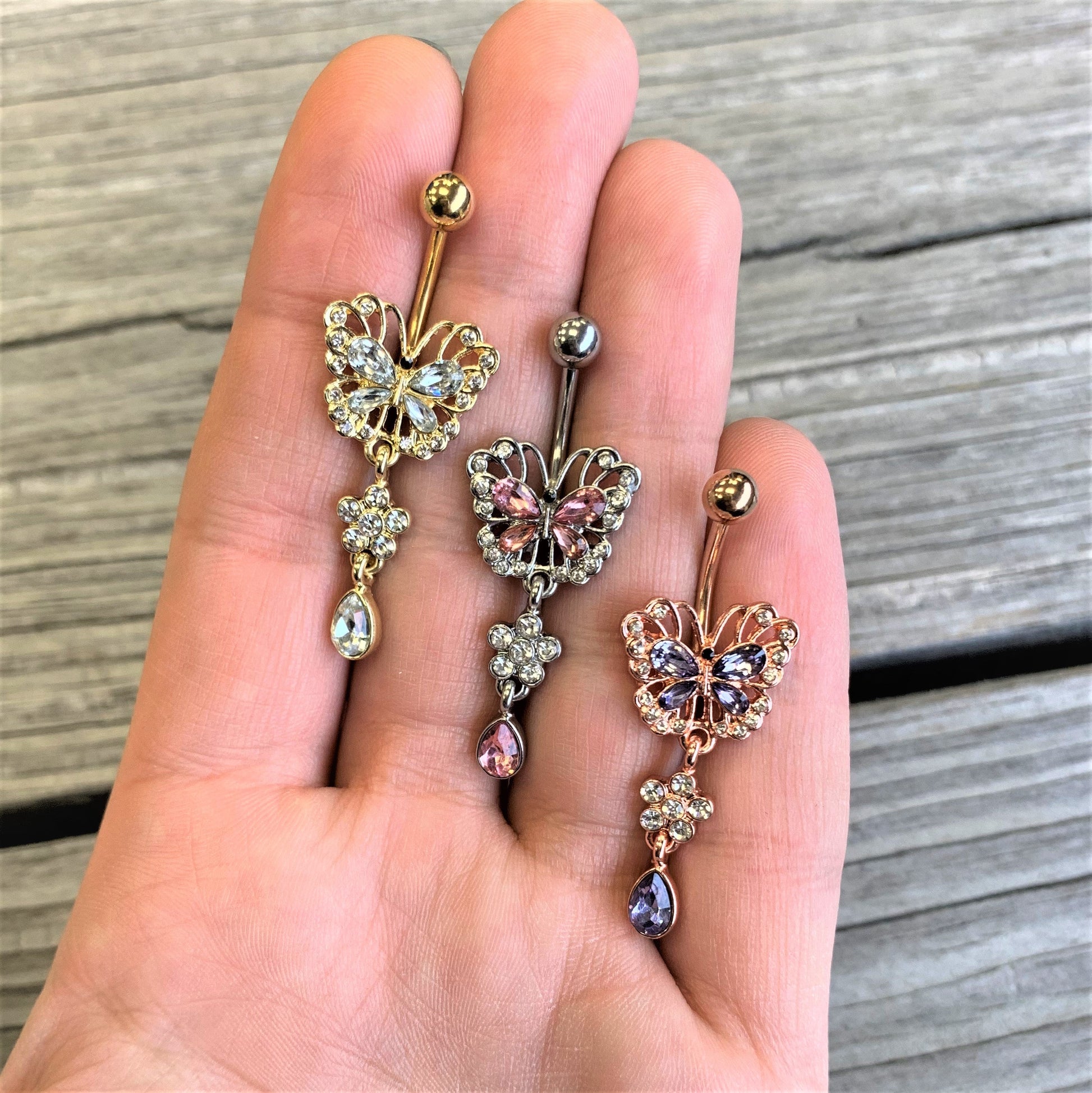 This butterfly is something you're sure to love with its lacy appearance and graceful drop dangle! It's made with a 3/8" gold tone plated over 316L surgical grade stainless steel curved barbell with a 5mm top ball end. The bottom end is a lacy looking, openwork style butterfly charm with clear gems. Dangling beneath the butterfly is a small flower charm composed of small clear gems. The piece is finished up with a clear gem drop dangle charm below the flower. The contrast of materials and shapes combined with its sumptuous styling make this one seriously eye-catching navel ring!Specifications