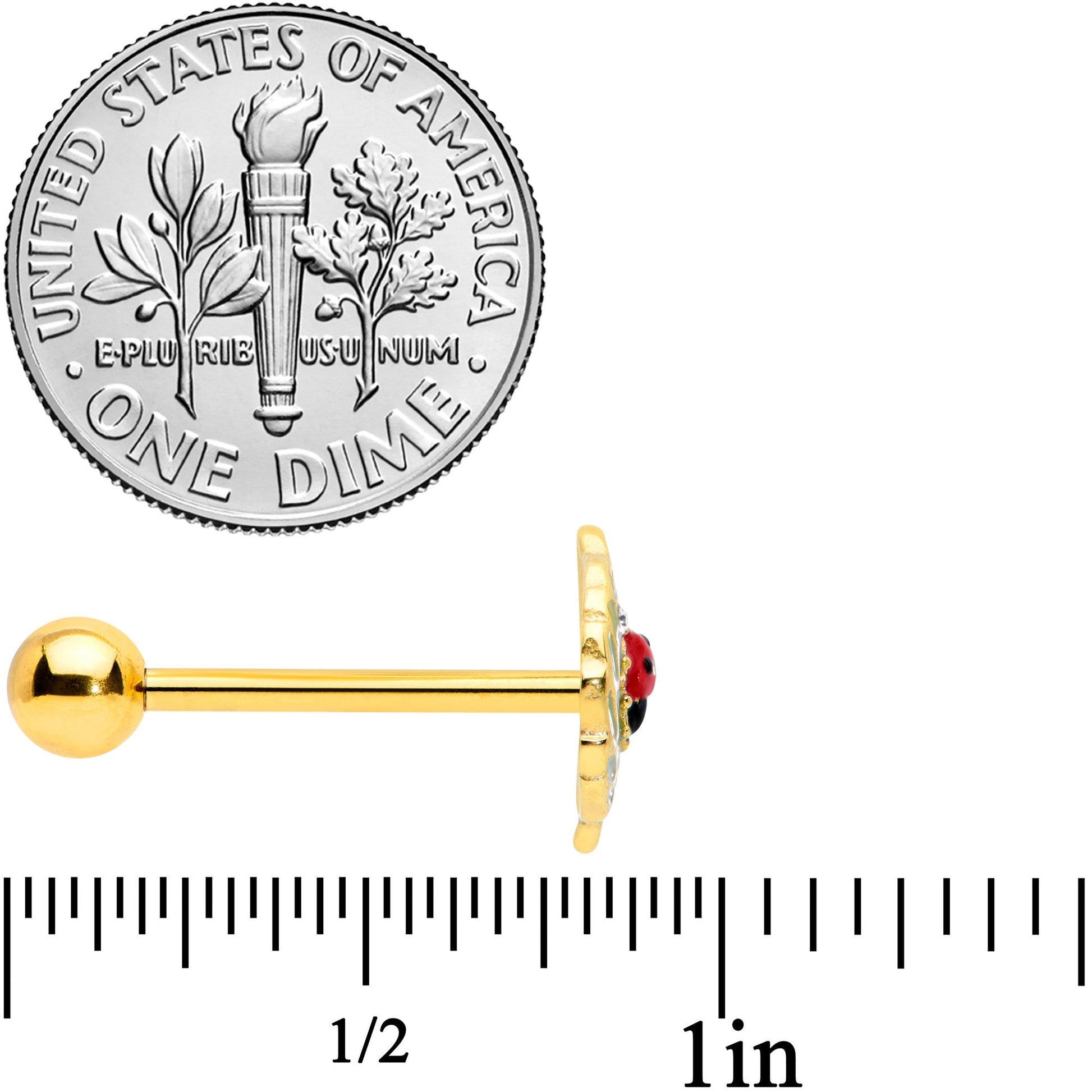 The little ladybug on this 14 gauge tongue piercing ring has found a perfectly gorgeous place to chill! It's made with a 5/8" gold tone PVD over 316L surgical grade stainless steel straight barbell with a 5mm bottom ball end. The top end features a leaf charm, with matching tone detailing. The leaf features a tiny ladybug embellishment, a sweet surprise for those who look closer, as well as small clear gem. Let your style feel as relaxed and contemporary as the ladybug on this charming tongue jewelry!Specifications