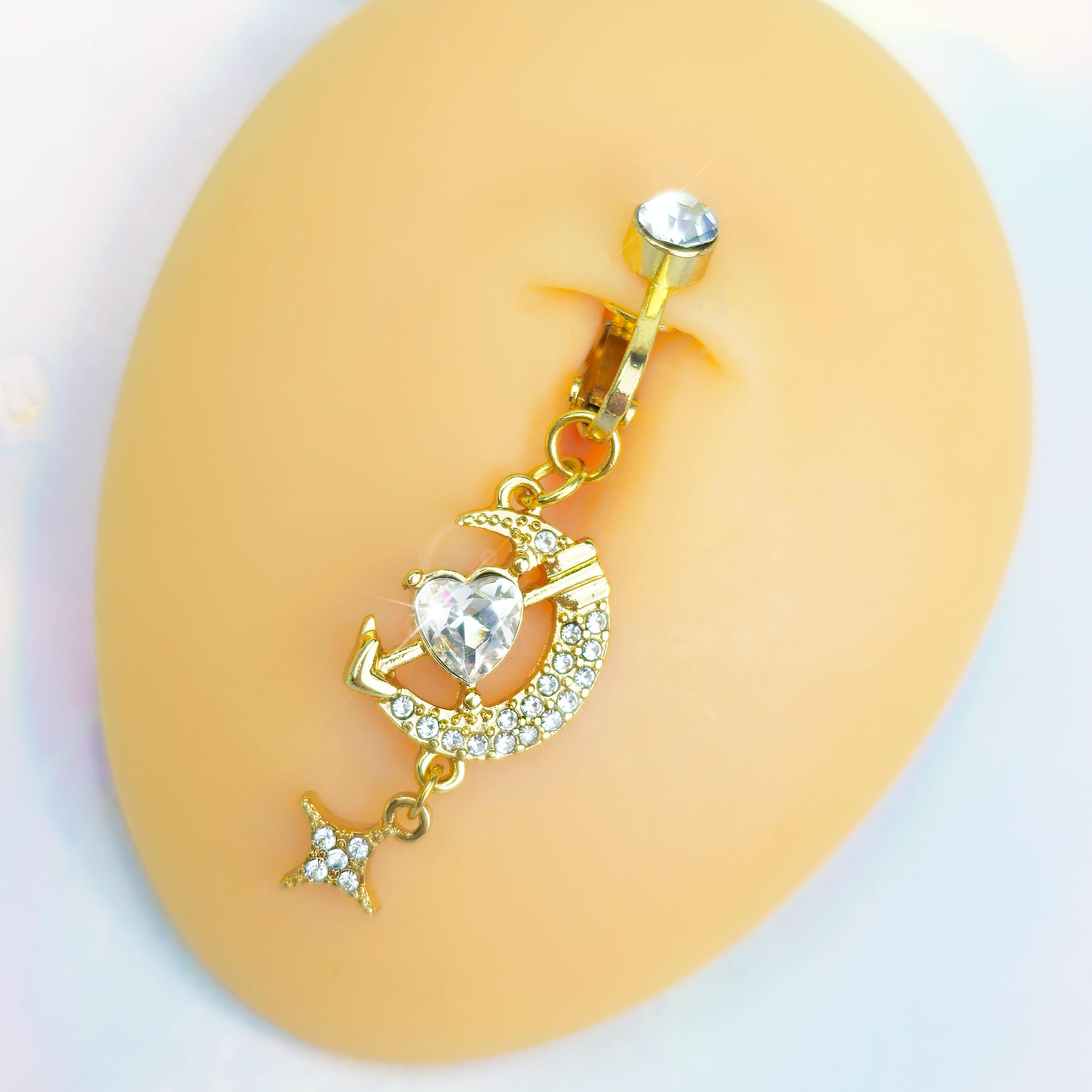 If you like the look but aren't ready to commit yet, this faux navel ring is perfect for you! It is made with gold tone plated brass and features a clip on design to hold it securely in place without the need of a trip to the piercer. It features a crescent moon charm, paved with clear gems. Nestled in the curve of the moon is a clear gem heart, pierced with an arrow embellishment and also features a textured star dangle. Try out a new look before you commit with this fake belly piercing jewelry.Specifications