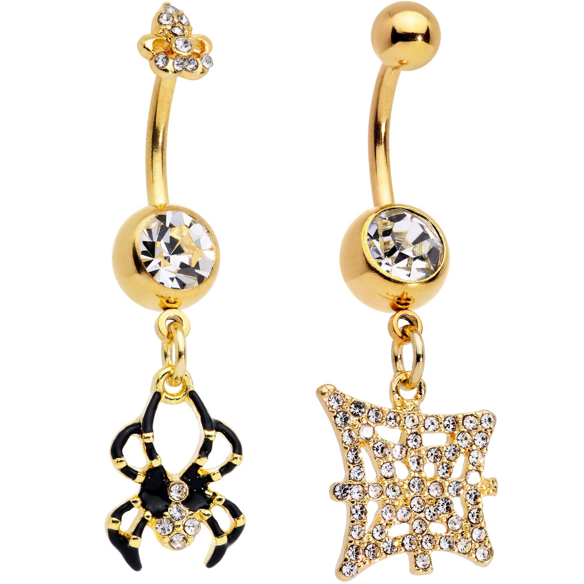 Spin a web of sexy style with this set of 14 gauge navel rings! They're both made with 3/8" gold tone PVD over 316L surgical grade stainless steel curved barbells. One has a 5mm top ball end and an 8mm bottom ball end that's set with a large clear gem. Dangling beneath it is a spiderweb charm paved with tiny clear gems. The other one features a geometric top end, set with tiny clear gems, and an 8mm bottom ball end that's set with a large clear gem. Dangling beneath it is a spider charm in black and five clear gems for a cohesive look. This arachnid themed belly button jewelry is sure to get everyone caught in your web of creepy crawly comeliness! Sold as a set of two.Specifications