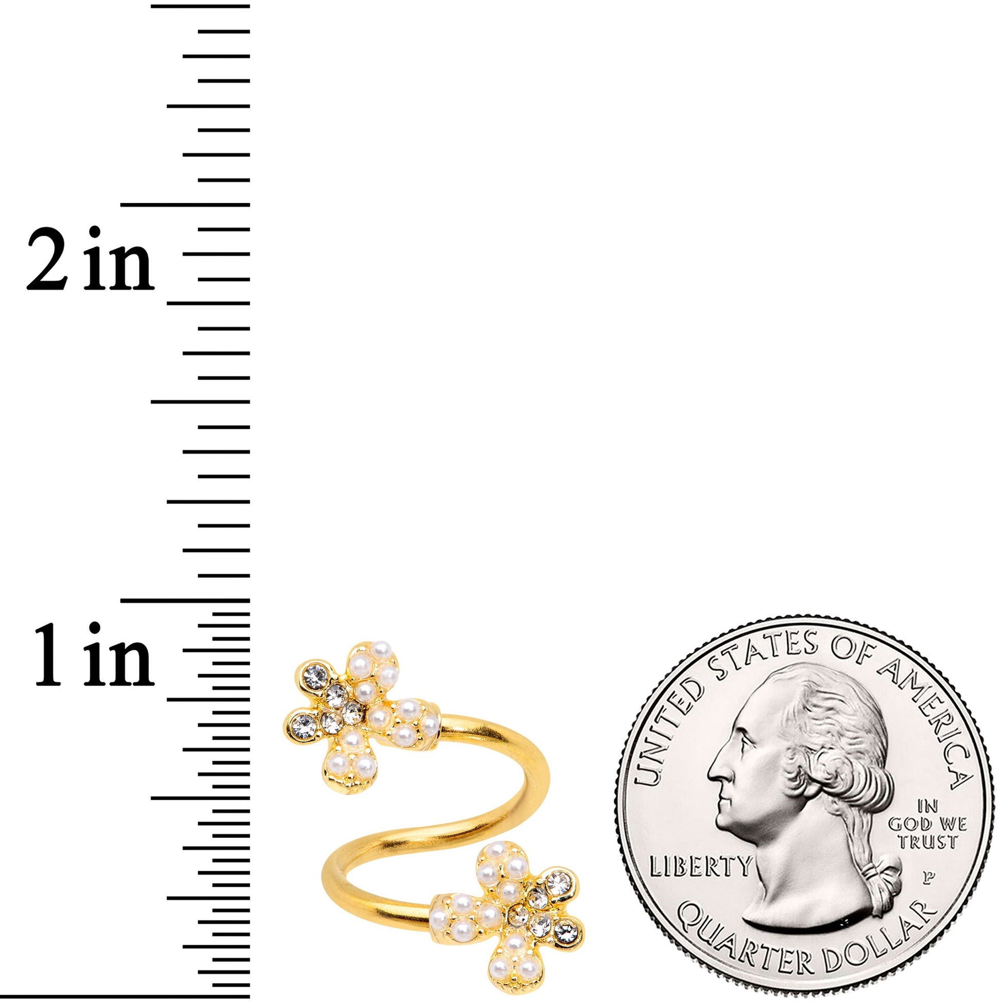 The splatter on this 14 gauge navel ring is one you won't be in a hurry to mop up! It's made with a 3/8" gold tone PVD over 316L surgical grade stainless steel spiral curved barbell. Each of the ends features a whimsical splat charm, set with white orbs on the right and with clear gems on the left. You can even sport this splat in multiple piercings including navel, lip, helix, and some eyebrow piercings. With it's charming shape, luxe detailing, and clever design, this is one splat that's sure to suit any style!Specifications