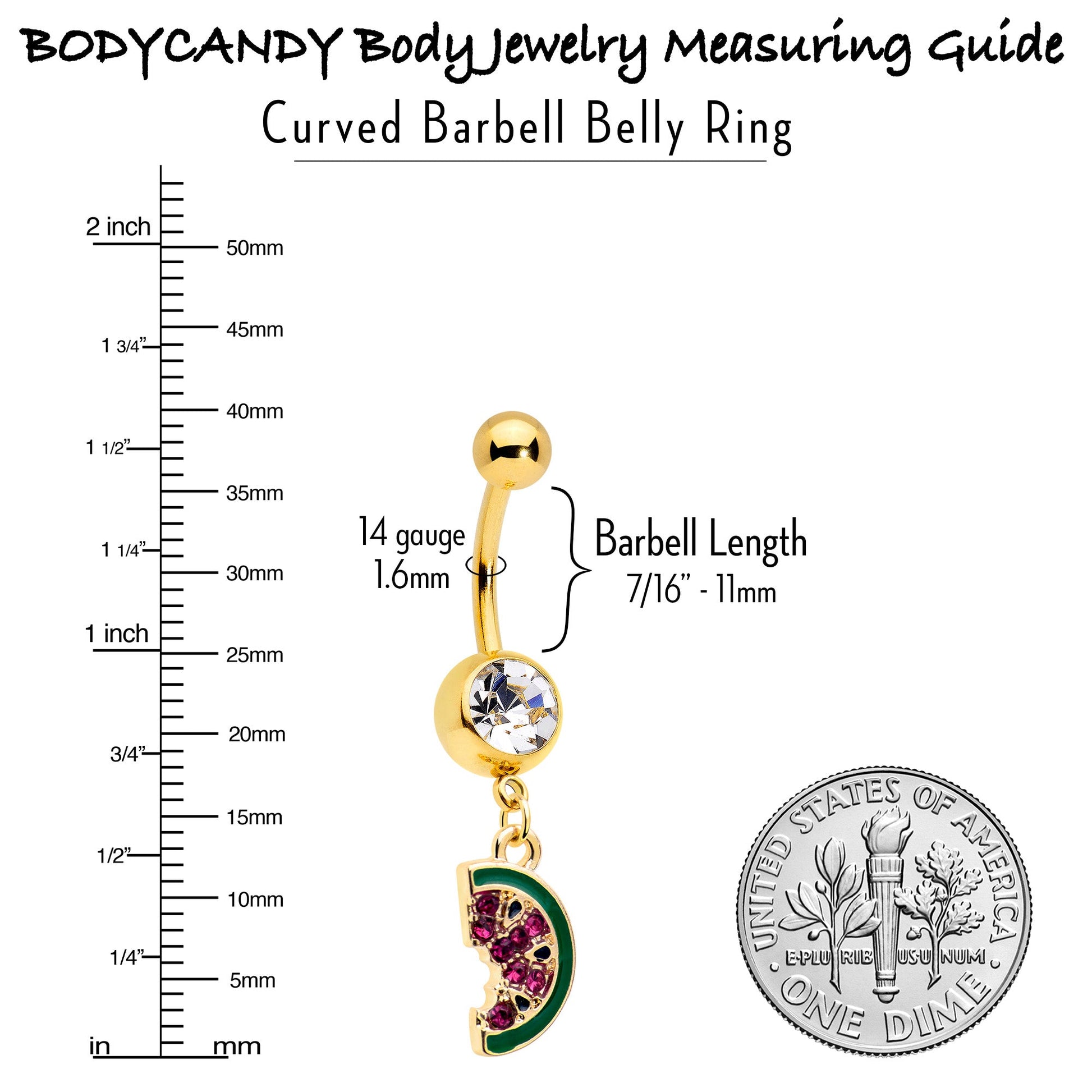 Take a bite of style with this tasty 14 gauge navel ring. It is made with a 3/8 inch gold tone PVD over 316L surgical grade stainless steel curved barbell with a 5mm top ball end. The bottom ball end is 8mm and set with a clear gem. Dangling beneath it is a watermelon slice charm, inlaid in green with red and black seed gems. The tasty fruit even has a bite already taken out. You too will find this yummy melon belly piercing ring irresistible.Specifications