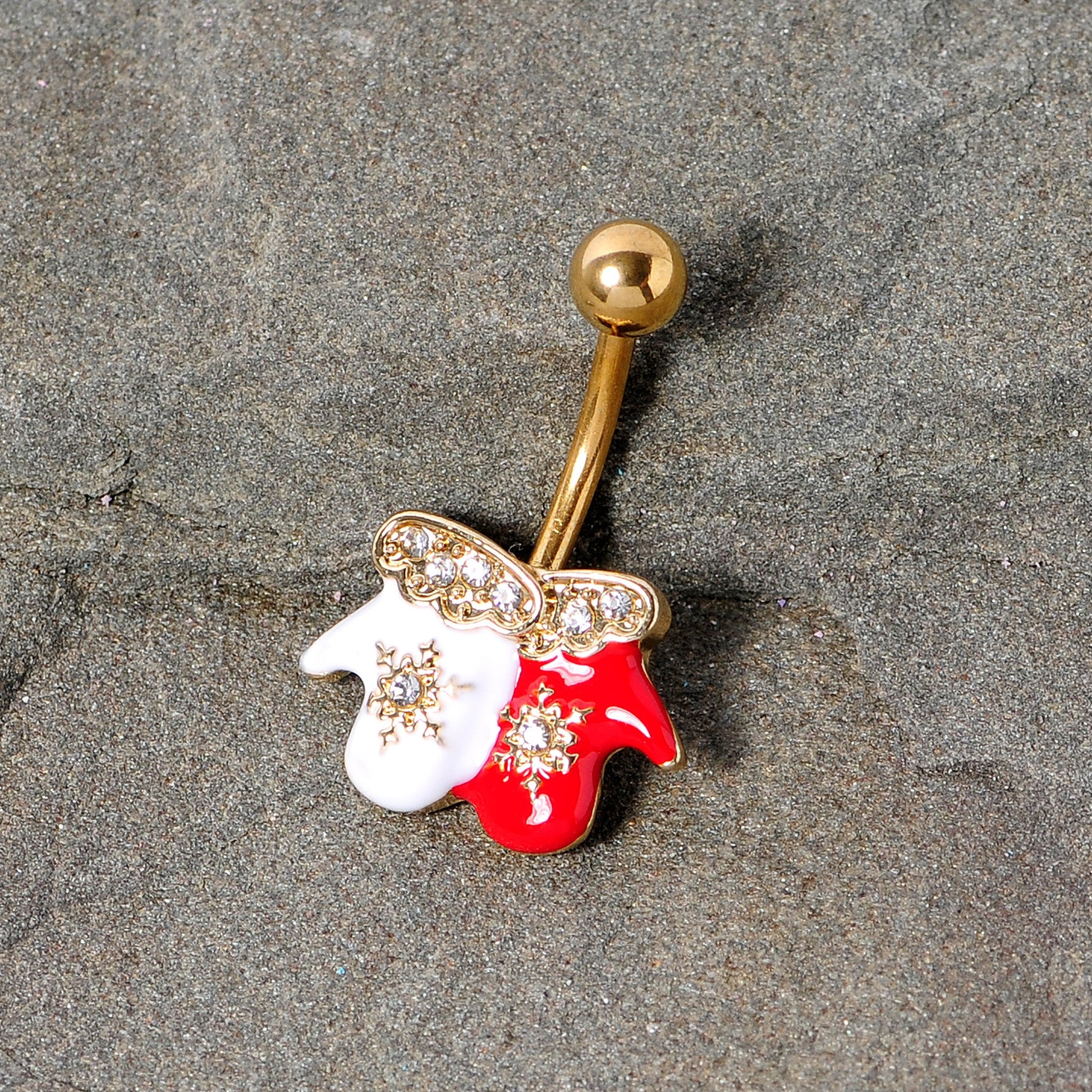 If you can't wait for the first snow day this holiday season then this 14 gauge Christmas belly button ring is right for you! made with a 10mm gold tone plated over 316L surgical grade stainless steel curved barbell, this navel ring features a red and white winter mittens charm complete with clear gem star details and clear gem liners along the top of the charm that makes the winter gloves look warm and fashionable too!Specifications